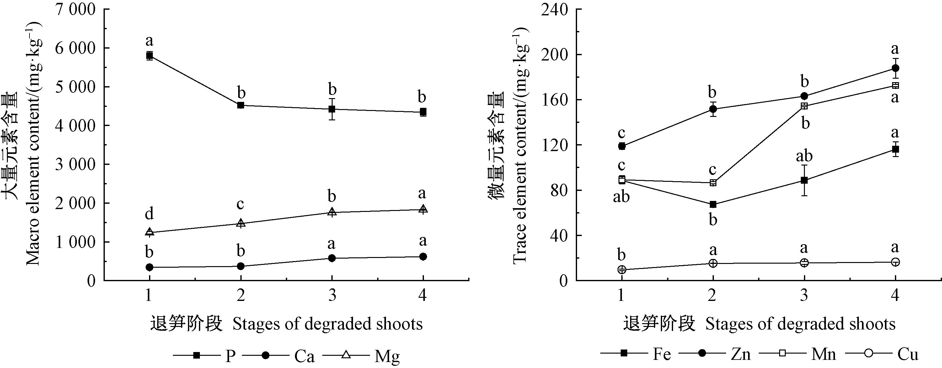 目的: 调查厚竹出退笋规律,探讨厚竹退笋过程中营养品质的变化特点,为合理利用退笋、提高厚竹林的综合效益提供理论依据。方法: 观察厚竹竹笋的高生长过程,统计出笋量和退笋量,测量竹笋高度,总结厚竹出退笋规律;并采用常规化学成分分析方法测定退笋不同阶段营养成分的含量,原子吸收分光光度法测定矿质元素含量,全自动氨基酸分析仪测定氨基酸含量,分析退笋过程中营养成分的变化规律。结果: 1)2015年、2017年和2018年厚竹出笋量分别为1 171、818和575株,出笋规律呈正态分布曲线,且从出笋初期至末期退笋率升高。退笋高度主要集中在50 cm以内,其中30 cm高度以下的退笋占比分别高达69.81%、83.60%、86.09%,且在相同时间内,退笋高生长量低于正常笋。2)与正常笋相比,厚竹退笋的粗蛋白、可溶性糖和淀粉的含量均下降,而灰分、酸性洗涤纤维则高于正常笋,脂肪含量与健壮笋无显著差异(P>0.05);厚竹不同矿质元素含量由高到低依次为:P > Mg > Ca > Zn > Mn > Fe > Cu,其中P含量表现为正常笋高于退笋,其余均是退笋显著高于正常笋(P < 0.05),且随退败程度加深呈增加趋势;厚竹退笋与正常笋都含有17种氨基酸,退笋氨基酸总含量显著低于正常笋,且随退败程度加深呈下降趋势,退笋中期和后期氨基酸总量无显著差异。但退笋中主要鲜味类氨基酸含量比例增加。结论: 厚竹每年大量出笋,大小年差异没有毛竹明显,更适于培育优质竹林,具有较高的经济价值。厚竹退笋率整体较高,退笋高度集中分布在50 cm以内。厚竹退笋主要集中在高生长初期。厚竹退笋仍富含蛋白质、氨基酸、矿质元素等物质,具较高的食用价值,及时开发利用退笋可提高竹林生产效益。