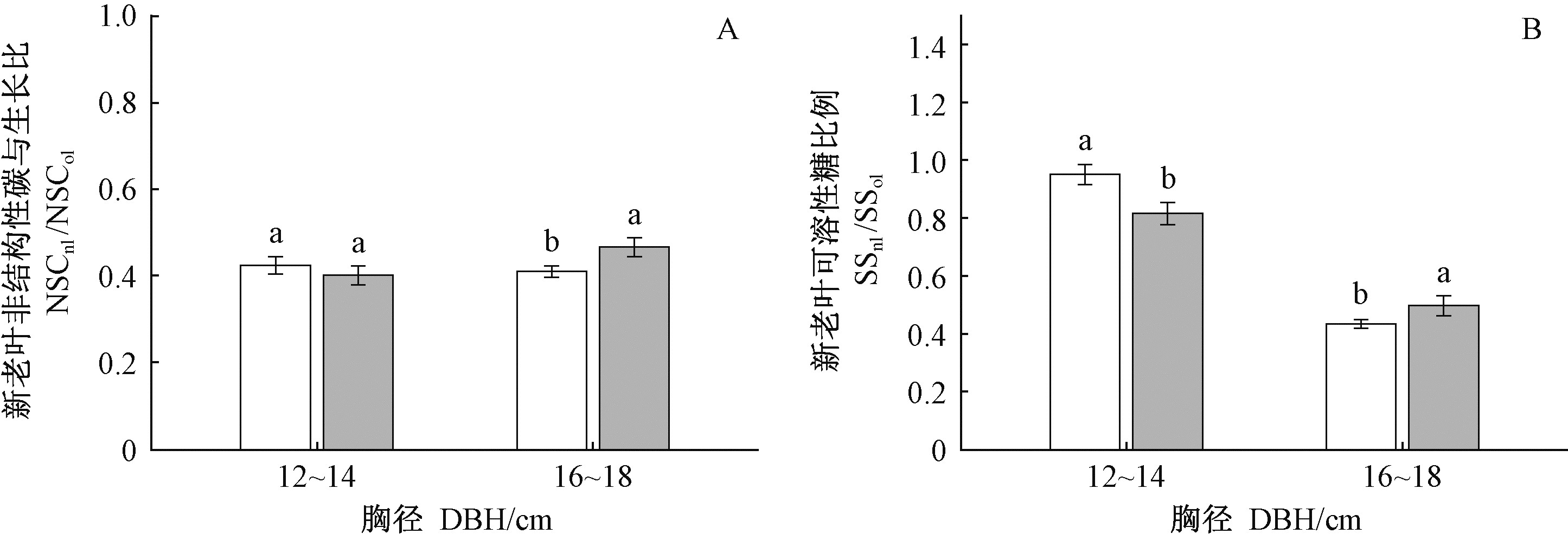 目的: 探讨不同径级中龄杉木生长速率对林下植被管理措施的响应机制,为中龄杉木的科学管理策略提供理论支撑。方法: 依托2013年建立的亚热带中龄杉木人工林林下植被管理实验平台中1998年种植的杉木林。试验处理为保留林下植被(CK)和清除林下植被(UR)。至2016年,12~14 cm和16~18 cm两径级杉木占CK处理总林木数的42.6%,占UR处理总林木数的77.1%。2016—2018年研究了这两径级中龄杉木的化学计量、资源获取及利用效率、碳分配模式(如结构vs非结构性碳(NSC)间的分配,NSC在不同器官间的分配)及相对生长速率(RGR)。结果: 清除林下植被对不同径级的中龄杉木RGR的影响不同。清除林下植被对12~14 cm径级中龄杉木RGR无显著影响,但会减缓16~18 cm径级中龄杉木的生长。清除林下植被对12~14 cm、16~18 cm两径级的中龄杉木最大净光合速率、水分利用效率、光合氮利用率、叶片全氮(N)、全磷(P)含量、N/P及叶片NSC(NSCleaf)、枝条NSC(NSCbranch)和树干NSC(NSCtrunk)均无显著影响。对于16~18 cm径级的中龄杉木而言,清除林下植被显著降低新叶NSC(尤其是可溶性糖,SS)含量,增大NSCtrunk/RGR和NSCleaf/RGR,使林木光合产物优先用于存储而非生长,进而减缓了林木的RGR。对于12~14 cm径级的中龄杉木而言,清除林下植被虽然显著增加新叶与老叶间SS的比值,但NSCleaf/RGR是影响该径级的中龄杉木RGR的主要因素,而清除林下植被对该径级NSCleaf/RGR无显著影响。结论: 林下植被去除对中龄杉木生长速率影响的径级依赖性主要受碳分配机制调控,而非受养分化学计量、资源获取及利用效率等机制影响。