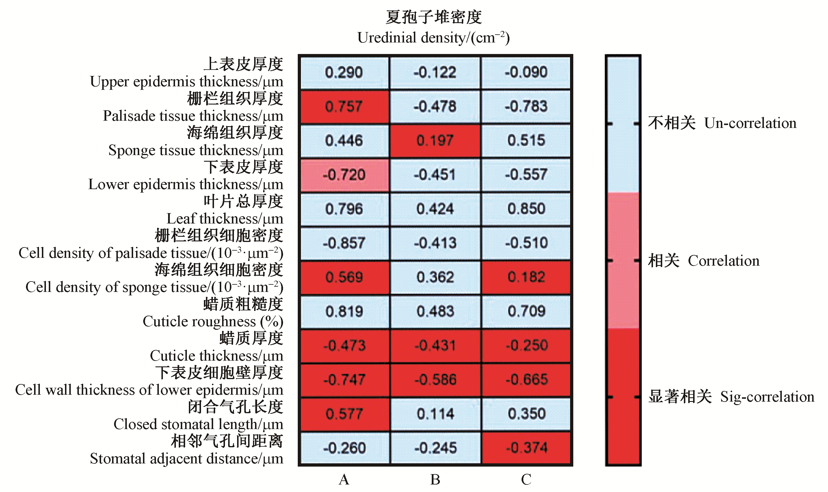 目的: 分析杨树叶片物理结构与其抗锈性的相关性,并提出相应的形态学指标,为指导生产中抗锈病杨树种质筛选提供参考。方法: 调查西北农林科技大学渭河实验站29种杨树无性系秋末夏孢子堆密度;并采集树冠下层成熟叶片,通过光学显微镜、透射电镜、扫描电镜分析杨树叶片解剖结构间的差异,蜡质厚度、上下表皮厚度、栅栏组织厚度、海绵组织厚度等12个叶片结构指标与叶片夏孢子堆密度的相关性。结果: 在夏孢子堆密度Euclidean聚类中,29个杨树无性系可分为3组,结合杨树派别分类得出白杨派杨树为Melampsora larici-populina的非寄主、黑杨派为较强抗病寄主、青杨派为易感病寄主,黑杨派69杨♀与青杨派青杨♂杂种一代(F1)呈现出易感病特征,杂交杨树抗锈性与父本抗性密切相关。寄主杨树中下表皮厚度、海绵组织厚度、叶片总厚度显著大于非寄主杨树;而栅栏组织厚度、相邻气孔距离及海绵组织细胞密度则显著小于非寄主杨树。在寄主杨树中易感病组上表皮厚度显著小于较强抗性组。相关性综合分析表明蜡质厚度、下表皮细胞壁厚度与抗锈病能力具有一个稳定的正相关关系。结论: 不同杨树的抗锈病能力具有显著的差异,蜡质厚度和下表皮细胞壁厚度可作为快速筛选抗锈病杨树品种的2个形态学指标。