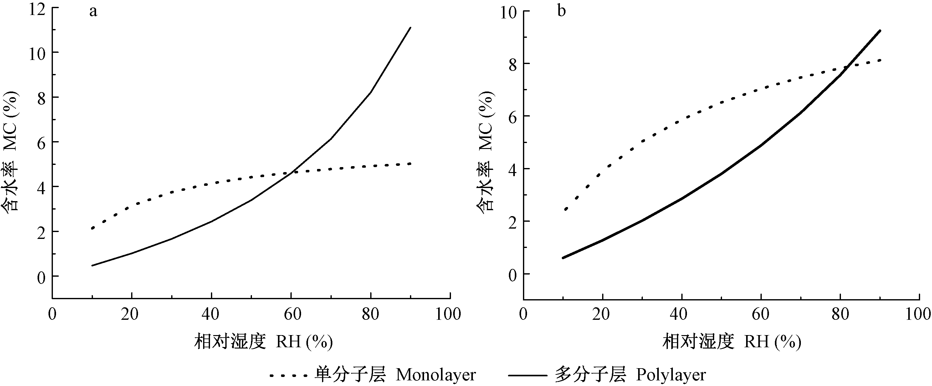 目的: 研究单叶省藤材水分吸附的变化规律,阐明藤材内部水分吸附变化的深层机理,为解决藤材安全贮存与合理加工利用过程中由水分吸附和散失引起的质量问题提供理论依据。方法: 采用动态水蒸气吸附仪测定藤材的水分吸附行为,选择H-H模型、GAB模型、Halsey模型、Henderson模型、Oswin模型和Smith模型对平衡含水率(EMC)数据进行非线性拟合并评价其拟合效果,运用最佳拟合模型分析水分吸附过程中平衡含水率、单分子层吸附水和多分子层吸附水的变化规律。结果: 单叶省藤材水分吸附等温线呈"S"形,属于第Ⅱ类等温线,具有多分子层吸着特性;与木、竹材相似,单叶省藤材在整个吸湿过程中表现出明显的吸湿滞后现象,且其吸滞滞后率在相对湿度(RH)80%时达0.8,早于木材(RH=95%);6种模型中,H-H模型和GAB模型对数据的拟合度最高,R2均高于0.99;H-H模型中代表含有单位摩尔数吸附位的绝干藤材质量参数(W1)显著低于木、竹材,在吸湿阶段,当RH < 60%时,主要以单分子层吸附为主,单分子层吸附水含量为6.80%;通过GAB模型计算得出藤材吸湿阶段的水分可及内比表面积(S)和单分子层吸附水含量(W0)分别为293 m2·g-1和7.67%,均大于木、竹材,分析其原因可能是单叶省藤材的纤维细胞壁薄腔大,相邻薄壁细胞之间的空隙较大且结晶度较小;由H-H模型和GAB模型推测出的纤维饱和点(FSP)分别为20.28%和18.67%。结论: H-H模型和GAB模型可用于描述单叶省藤材水分吸附等温线,拟合度较高;单叶省藤材的化学组分含量、解剖构造和结晶度是影响其单分子层吸附水含量的主要因素,单叶省藤材单分子层吸附水含量略高于竹材,水分可及内比表面积大于竹材。
