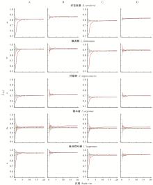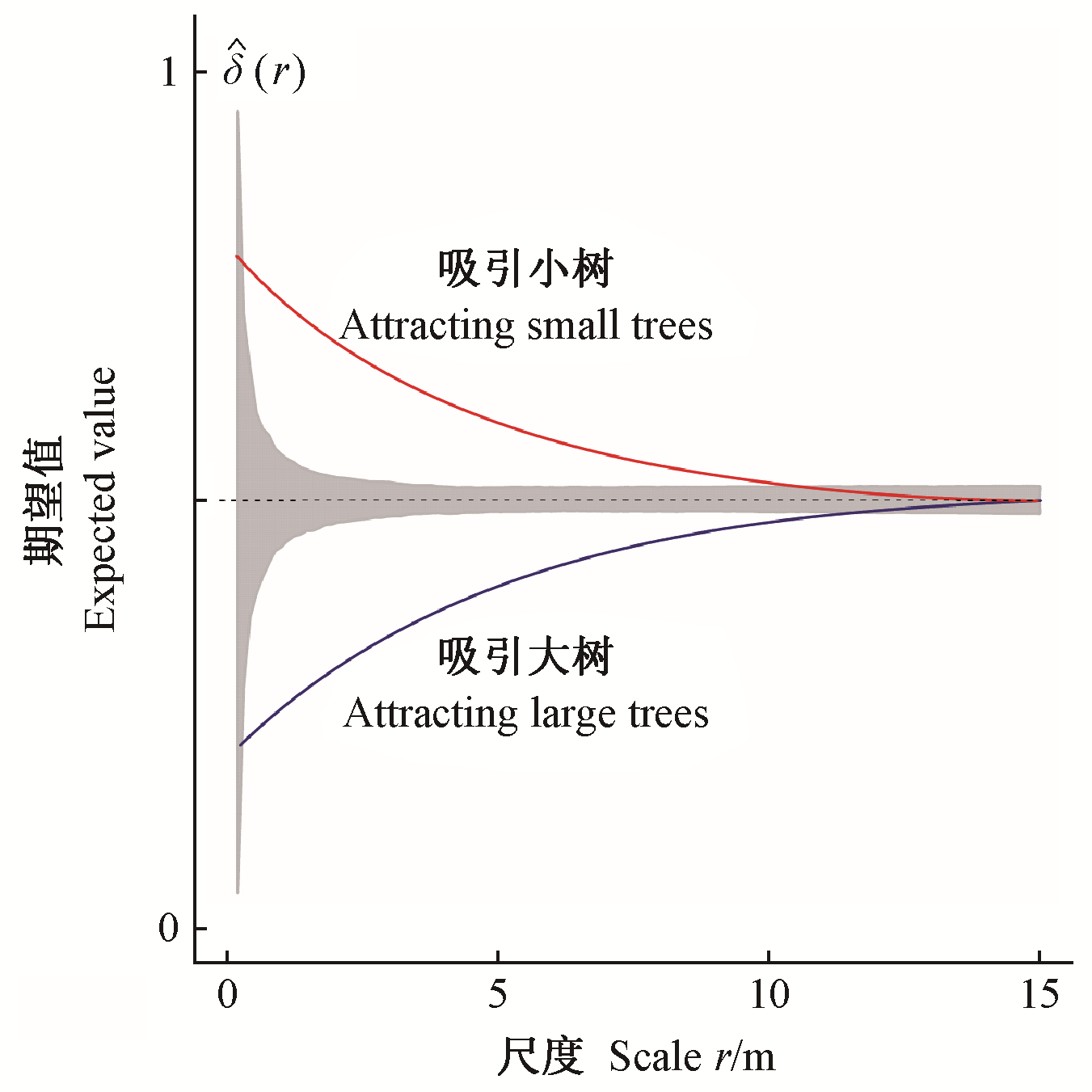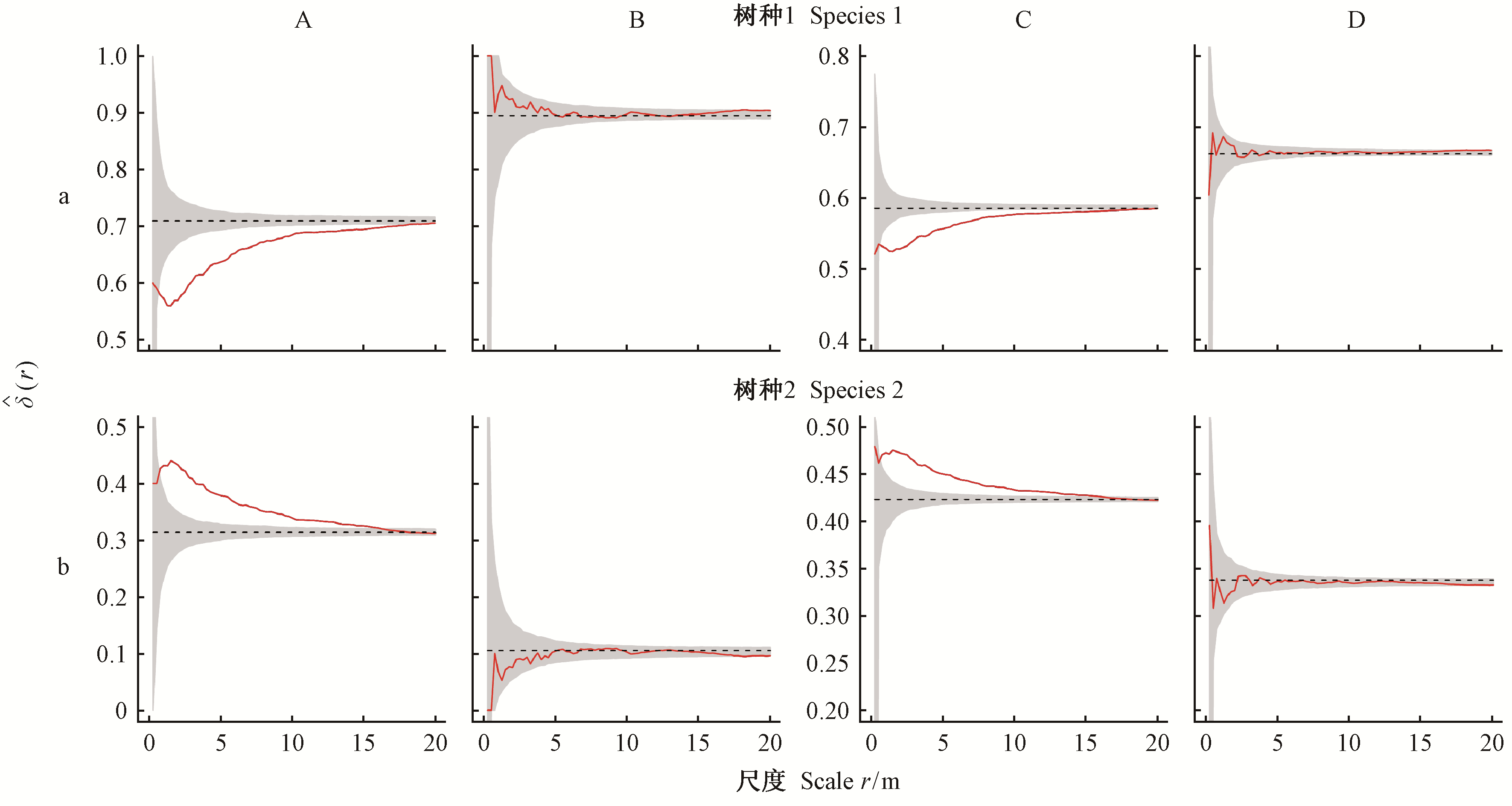 目的: 详细刻画和分析树种空间优势度, 为关键树种保护和森林群落物种多样性维持提供理论依据。方法: 基于林木空间优势度指数(大小比数和双曲正切指数)构造标记二阶特征函数, 通过模拟数据检验标记二阶特征函数的有效性以及同种空间聚集对树种空间优势度的影响, 在此基础上以雅长自然保护区1.6 hm2实测样地为研究对象, 详细分析样地中主要树种空间优势度在不同空间尺度上的变化, 探究树种空间优势度与树种混交之间的关系。结果: 1) 研究森林群落属老龄林, 结构多样性丰富, 共记录木本植物35科61属86种, 断面积49.81 m2·hm-2。群落中不同树种具有不同胸径分布范围, 其中以较大径级树种如多花杜鹃、枫香树等为主要建群种, 较小径级树种如细齿柃、榕叶冬青等个体数量较多, 在林分中占有一定地位, 不同树种的大小比数和双曲正切指数表明, 树种平均胸径与其优势度存在显著正相关关系。2)群落中主要树种在小尺度范围内均存在吸引相似大小林木的趋势, 较大径级树种空间优势度低于期望值和零模型模拟的随机区间, 较小径级树种空间优势度显著高于期望值, 随着尺度距离增加, 树种空间优势度趋于期望值。3)同种空间聚集可增加或减小树种空间优势度, 对枫香等大径级树种而言, 同种聚集导致其空间优势度降低, 而对榕叶冬青等小径级树种则相反。结论: 标记大小比数和双曲正切指数二阶特征函数能够精细刻画不同空间尺度上树种空间优势度; 树种间"空间隔离"效应可减轻优势树种对劣势树种的竞争排除作用, 有利于维持物种共存, 提高森林群落物种多样性。
