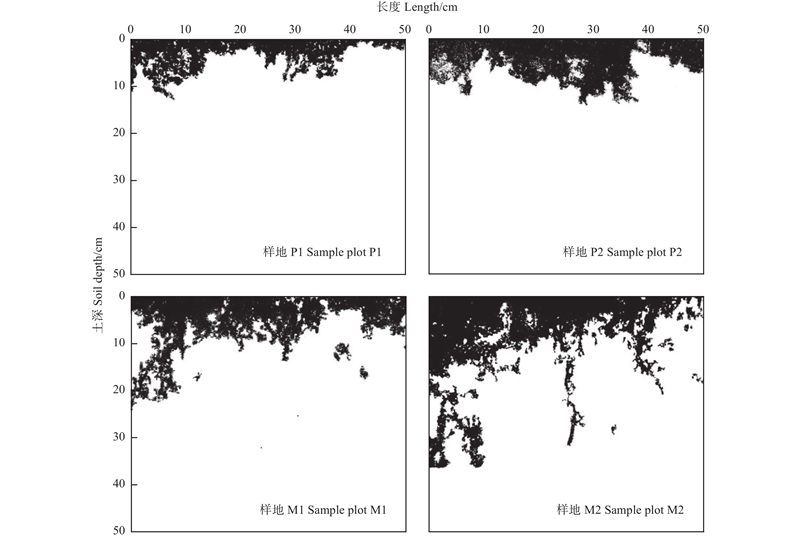 目的: 分析西南喀斯特地区纯林和混交林的土壤优先流特征,为当地森林植被恢复提供一定理论依据。方法: 选取2种典型森林植被类型(侧柏纯林和侧柏、马尾松、直杆蓝桉混交林),基于野外染色示踪试验,设置2种模拟降水量,使用亮蓝染料溶液染色,挖掘土壤的染色竖直剖面和水平剖面,借助图像处理技术,提取染色面积比、平均最大入渗深度、基质流深度、优先流比和长度指数5个优先流特征参数,同时获取不同深度处土壤的优先路径分布、数量和比例。结果: 当模拟降水量相同时,混交林的土壤染色面积比和平均最大入渗深度均高于纯林;当模拟降水量由25 mm增至60 mm时,混交林的土壤染色面积比由12.36%变为16.44%,平均最大入渗深度由22.21 cm变为30.64 cm,土壤染色面积比和最大入渗深度增幅相近;纯林的土壤染色面积比由7.42%变为15.89%,最大入渗深度由12.50 cm变为17.59 cm,土壤染色面积比增幅明显高于平均最大入渗深度。混交林下土壤染色形态呈指状或枝状,有独立斑块存在,纯林呈漏斗状,无独立斑块。当模拟降水量为25 mm时,混交林下基质流深度、优先流比和长度指数平均分别为1.65 cm、76.70%和352.61%,高于侧柏纯林的1.31 cm、74.33%和184.20%;当模拟降水量增至60 mm时,混交林下基质流深度、优先流比和长度指数为2.21 cm、77.18%和497.02%,而侧柏纯林则为4.29 cm、53.83%和331.27%。喀斯特地区混交林和纯林的优先路径主要分布在15 cm以上土层,且半径大多小于5 mm。混交林下土壤优先路径随土层深度的变异性更强,且大影响半径(>5 mm)优先路径的比例(19.0%)高于纯林(9.0%)。结论: 喀斯特地区侧柏纯林和侧柏、马尾松、直杆蓝桉混交林2种典型森林下均存在一定的优先流现象,由于其特殊土石结构影响,林地土壤优先路径数量较多;混交林下优先流的发育程度和空间变异性比纯林高,与其大影响半径优先路径比例高、优先路径分布变异性强有直接关系。