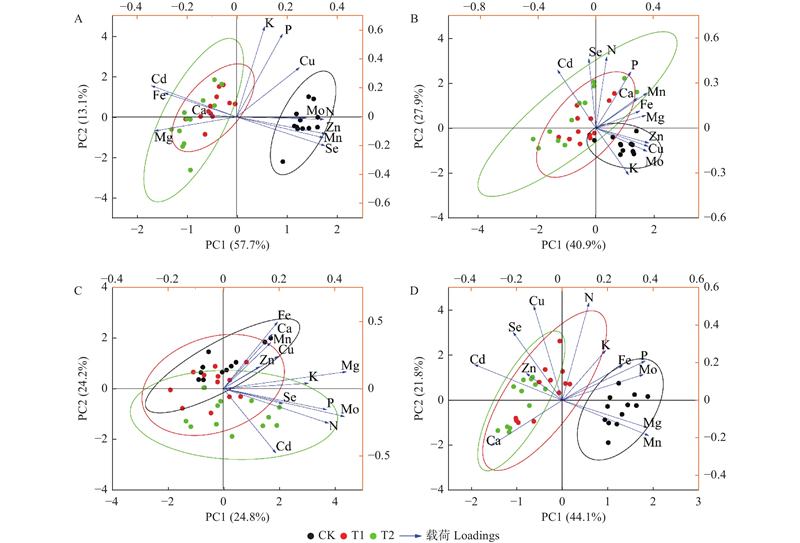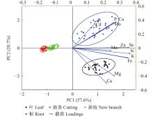 目的: 探究杞柳4个栽培品种在重金属镉(Cd)胁迫下的离子组响应特征,为选育高Cd富集型杞柳、提高杞柳对重金属污染土壤的修复效率提供理论依据。方法: 采用水培试验,分析杞柳4个品种‘大红头’、‘大青皮’、‘黄皮柳’、‘庄坞柳’在0、10、50 μmol·L?1的Cd(NO32处理下根、插条、新枝和叶组织Cd、大量元素(N、P、K、Ca、Mg)、微量元素(Fe、Zn、Cu、Mn、Mo、Se)含量变化,结合主成分分析、相关性分析以及偏最小二乘回归分析,明确Cd胁迫下杞柳不同组织离子组变异的元素贡献以及影响杞柳Cd积累和转运的主要元素。结果: 1) 大量元素特别是N的变异系数明显小于其他元素,叶片Cd变异系数明显高于其他组织;Mn、Zn和Fe等二价阳离子在Cd胁迫下的变异系数均较高。2) 杞柳离子组总变异的78.3%由组织类型的差异导致,其中Zn、Fe、Cu、Mn和Mo是杞柳离子组变异的重要组成部分。 3) Cd胁迫对不同组织离子组干扰程度为:根>叶>新枝>插条。4) 相关性分析发现,叶片Cd含量与Fe和Mg呈显著正相关;新枝和插条Cd含量与N和Se呈显著正相关;根部Cd含量与Ca、Cu和Se呈显著正相关。聚类分析和偏最小二乘回归确定N、P、Ca、K、Mn、Fe、Mg和Mo等元素在杞柳转运Cd的过程中起重要作用。结论: Cd胁迫导致的杞柳离子组变异,主要来源于组织类型的差异;同一组织中,离子组的变异主要来源于Cd胁迫,不同组织中引起离子组变异的主要元素各不相同。Cd在杞柳体内的转运受离子组变异影响,其中的大量元素N、P、K、Ca、Mg,微量元素Mn、Fe和Mo在杞柳转运Cd的过程中起重要作用。