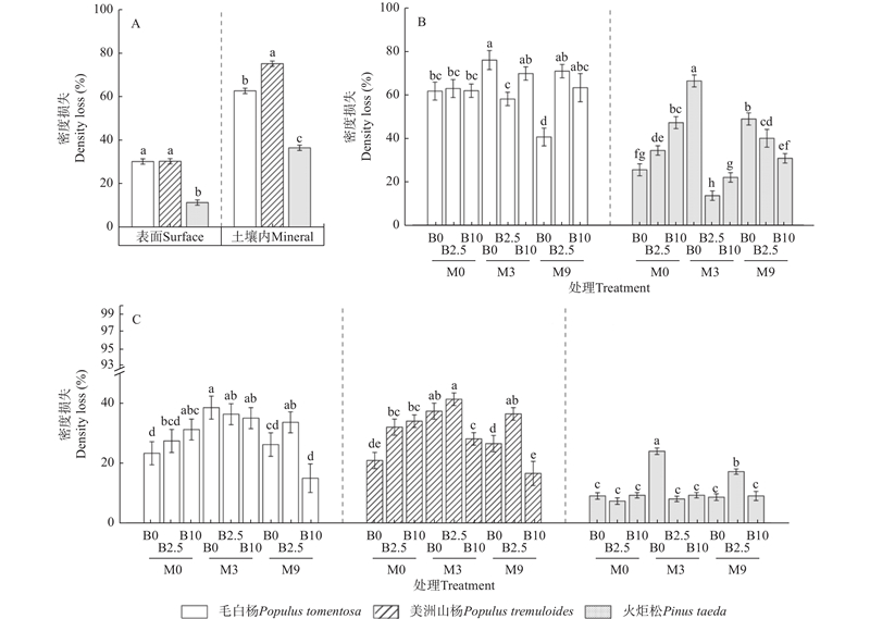 有机肥、生物炭对不同放置方式、不同树种木条密度损失和含水量的主效应和交互作用①"