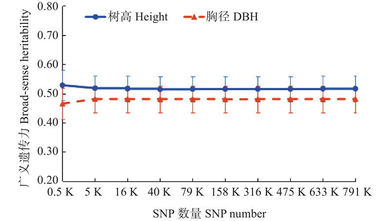 目的: 开展红锥全基因组选择(genomic selection,GS)研究和优良子代早期评选,对快速选育优良新品种具有重要意义。方法: 以红锥全分布区内226个无性系和覆盖23个半同胞家系的479株子代为试验材料,通过高通量重测序获取基因型分型数据,针对生长性状开展GS研究,采用5折交叉验证法评估5种GS模型和10种SNPs数量对GS预测准确性的影响;基于GS预测模型估计候选群体的基因组估计育种值(genomic estimated breeding value,GEBV),采用布雷金多性状评定法进行优良子代个体的早期综合评选。结果: 训练群体中,胸径性状的变异系数为22.73%,大于树高(17.13%),它们之间呈极显著正相关(r=0.63, P<0.001);树高和胸径在种源间均存在极显著差异(P<0.001)。参考群体和候选群体经重测序分型、数据质控后,每个个体得到790 877个SNPs,这些SNPs较均匀地分布在红锥基因组上。基于基因组最佳无偏估计(genomic best linear unbiased prediction,GBLUP)模型,训练群体树高和胸径的广义遗传力分别为0.52和0.48,不同标记SNPs数量对遗传力估计影响很小。在五种GS模型中,树高GS预测准确性最高的是Bayes B模型(0.21),胸径则是Bayes ridge regression(BRR)模型(0.06);贝叶斯模型预测准确性要优于GBLUP模型,但它们之间差异不显著。对于10种SNPs数量,在0.5~5 K阶段,GS预测准确性先升高,随后达到平台期。树高性状调用Bayes B模型,胸径性状调用BRR模型,对红锥候选群体各性状GEBV使用布雷金多性状综合评定法评选出15株优良子代个体,树高、胸径GEBV均值分别比参考群体均值提高了7.0%和5.2%。这些子代个体具体为4 438、4 468、4 407、4 388、4 052、4 461、4 390、4 389、4 410、4 399、4 460、4 467、4 212、4 044、4 459和4 020,主要来自F5和F29两个家系。结论: 本研究建立了红锥的GS预测模型,并依据候选群体GEBV进行了优良个体的早期评选,为后续红锥优良新品种的快速选育奠定了技术和材料基础。
