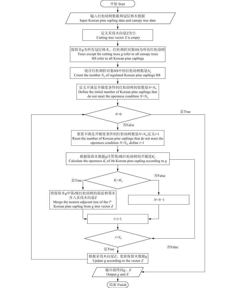 Objective: The purpose of this study was to improve the light conditions of the Korean pine saplings under the forest by simulating the cutting of the canopy layer of the secondary forest, so as to promote the growth and development of the Korean pine saplings and accelerate the recovery process of the secondary forest. Method: According to distance control and growth quality, Korean pine saplings were selected from the core area in a 1 hm2 large plot of Mongolian oak secondary forest. Individual openness optimization schemes with different thresholds (KT =1, 1.5, 2) were used to control the openness of target Korean pine saplings under the forest. The openness optimization scheme is implemented through a two-level iterative optimization method, encompassing both tree and stand levels. At the tree level, the objective is to ensure that the openness of each target Korean pine sapling meets the predefined threshold value. Simultaneously, at the stand level, the optimization involves controlling a specific target Korean pine sapling while taking into account other target Korean pine saplings within the stand. The changes of non-spatial structure (total diameter classes, total species and canopy density) and spatial structure (uniform angle index, neighbourhood comparison and mingling) of stands before and after simulated cutting under different openness thresholds were compared, as well as the differences in openness and openness change rate of Korean pine saplings under different treatments. Result: A total of 145 target Korean pine saplings were selected by distance control and growth quality. The target Korean pine saplings were 1.1?4.9 m in DBH, 1.5?4.7 m in height and 0.6?1.7 m in crown radius. When KT was 1, 1.5 and 2, the target Korean pine saplings reach the openness condition after cutting 14, 130 and 262 canopy trees for 3, 6 and 8 rounds respectively. After the optimized cutting simulation, the openness of Korean pine saplings was improved as a whole: when KT was 1, the openness increased by 5.7% on average compared with the control, but there was no significant difference; when KT was 1.5, the openness was 44.7% on average higher than that of the control, with significant difference; when KT was 2, the openness was 107.7% on average higher than that of the control, with significant difference. Pre- and post-simulated harvesting activities exhibited no alterations in the total diameter classes and total species within the forest stand. Moreover, spatial structural metrics exhibited minimal changes. Under three different thresholds of openness (KT = 1, 1.5, 2), the stocking intensity of harvesting is 1.5%, 15.6%, and 37.2% respectively. Compared with the canopy density of the control (CK) at 0.646, the canopy density under the three openness thresholds (KT = 1, 1.5, 2) decrease by 0.5%, 13.3%, and 33.1% respectively. Conclusion: The two-level iterative optimization method for the openness index of Korean pine saplings improved the light conditions of Korean pine saplings under the forest, while maintaining the stability of most stand structures, and the openness threshold KT =1.5 was better than KT =1 or 2. The optimization methodology introduced in this research enables the determination of key parameters, including the total count of cutting rounds, the number of cutting trees within each round, the openness regulation route of each target Korean pine sapling and the distribution of cutting trees under different openness thresholds. This comprehensive framework offers invaluable guidance for shaping the post-replanting thinning strategy of Korean pine saplings and informs best practices for managing secondary forest ecosystems.