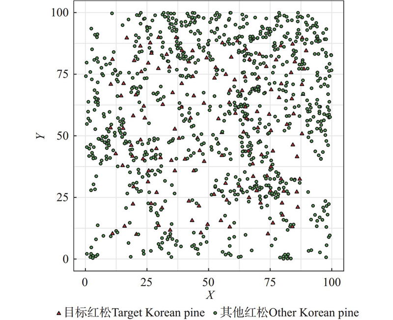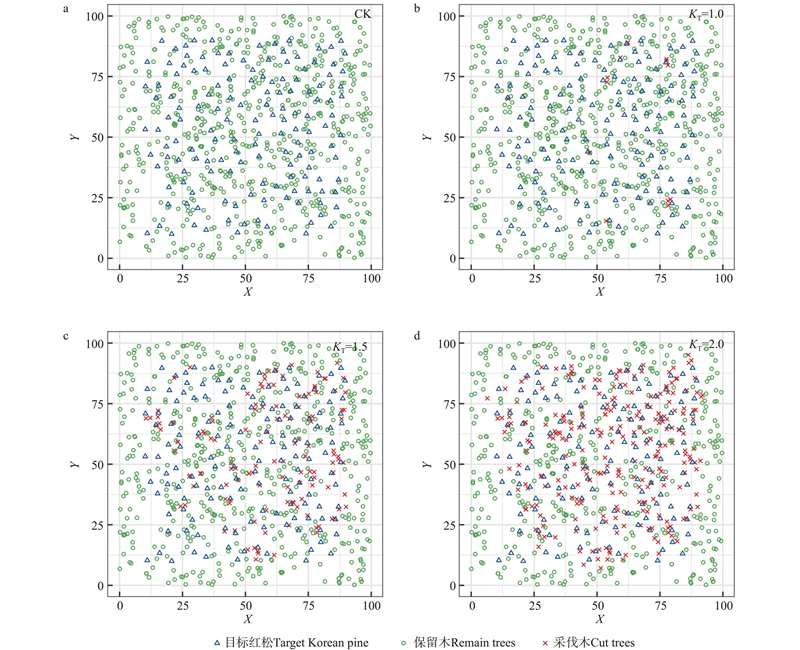 目的: 模拟采伐蒙古栎次生林冠层林木,有针对性地改善林下红松幼树光照条件,促进红松幼树生长发育,为加快次生林向顶级群落恢复提供科学依据。方法: 以蒙古栎次生林1 hm2大样地为研究对象,通过距离控制和长势优劣从核心区筛选出满足条件的目标红松幼树。采用不同阈值(KT =1、1.5、2)的个体开敞度优化方案调控林下目标红松幼树的开敞度,开敞度优化方案通过开敞度两水平(包括林木水平和林分水平,林木水平指保证每一株目标红松幼树的开敞度均达到阈值,林分水平指调控某一株目标红松幼树的同时兼顾林分中其他目标红松幼树)迭代优化方法实现。比较不同开敞度阈值下模拟采伐前后林分非空间结构(林分总径级数、总物种数和郁闭度)和空间结构(角尺度、大小比数和混交度)的变化,以及不同处理间红松幼树开敞度和开敞度变化率的差异。结果: 通过距离控制和长势优劣共筛选出145株目标红松幼树,幼树胸径介于1.1~4.9 cm之间、树高介于1.5~4.7 m之间、冠幅半径介于0.6~1.7 m之间。KT为1、1.5和2时,目标红松幼树分别经3、6和8轮以及采伐14、130和262株冠层林木后达到开敞度条件。模拟优化采伐后,红松幼树开敞度得到整体改善:KT为1时,开敞度平均比对照增加5.7%,但无显著差异;KT为1.5时,开敞度平均比对照增加44.7%,差异显著;KT为2时,开敞度平均比对照增加107.7%,差异显著。模拟采伐前后,林分总径级数和总物种数不变,空间结构指标均无显著变化。3种开敞度阈值(KT =1、1.5、2)下,采伐的蓄积强度分别为1.5%、15.6%和37.2%。与未采伐林分(CK)的郁闭度(0.646)相比,3种开敞度阈值(KT =1、1.5、2)下的郁闭度分别降低0.5%、13.3%和33.1%。结论: 红松幼树开敞度两水平迭代优化方法在改善林下红松幼树光照条件的同时可保持大部分林分结构稳定,开敞度阈值1.5优于1或2。本研究提出的优化方法可获得不同开敞度阈值下采伐总轮数、每轮采伐木数量、每株目标红松幼树开敞度调控路线以及采伐木分布情况,对于补植后红松幼树的开敞度调控以及次生林的管理实践具有较大指导价值。