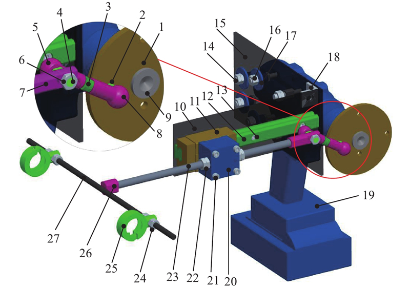 便携式蓝莓采摘机结构 1.曲柄Crank;2.曲柄转接轴Crank transfer shaft;3.连杆轴Connecting rod shaft;4.连杆转接轴Connecting rod transfer shaft;5.关节轴承b Joint bearing b;6.连杆锁紧螺母Connecting rod lock nut;7.推杆固定轴a Push rod fixed shaft a;8.关节轴承a Joint bearing a;9.曲柄轴Crank shaft;10.导轨连接板Guide rail connecting plate;11.T型滑块 T-slider;12.导轨Guide rail;13.导轨固定螺丝Guide rail fixing screws;14.转接板固定螺丝Transfer plate fixing screws;15.导轨架板Guide rail rack plate;16.转接板固定螺母Transfer plate fixing nut;17.转接板连接垫片Transfer plate connecting spacer;18.角件Corner piece;19.手电钻Hand drill;20.滑块连接件Slider connector;21.滑块固定螺丝Slider fixing screw;22.滑块锁紧螺母Slider lock nut;23.推杆轴Push rod shaft;24.卡箍锁紧螺母Clamp lock nut;25.卡箍Clamp;26.推杆固定轴b Push rod fixing shaft b;27.卡箍轴Clamp shaft."