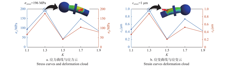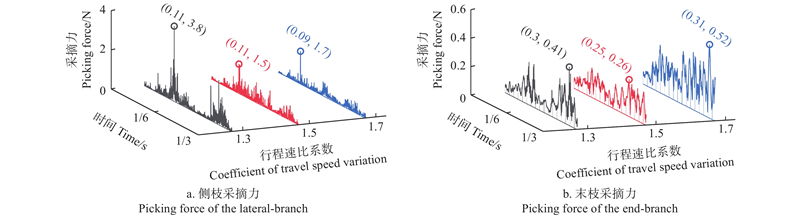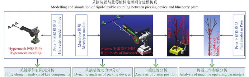 目的: 研制一款针对山地种植、小规模经营散户的手持便携式蓝莓采摘机,通过刚柔耦合动力学仿真与蓝莓采摘田间试验分析不同工况下采摘机的工作性能,解决人工采摘蓝莓采摘效率低、劳动强度大、果实损伤率高等问题,为蓝莓机械采摘装置的结构设计提供理论参考。方法: 基于采摘机的整机结构和工作原理,对采摘装置进行力学分析,对关键零部件进行有限元分析,分析采摘装置与蓝莓植株相互作用过程中的采摘振动机理。根据蓝莓采摘作业要求,应用Hypermesh、Ansys软件将采摘机关键零部件与蓝莓植株三维模型转换为柔性体,在Adams中建立采摘装置与蓝莓植株的刚柔耦合力学仿真模型,设置蓝莓果实在植株上的分布位置。通过蓝莓采摘仿真试验分析行程速比系数K、手电钻转速n和卡箍夹紧位置对系统动力学性能以及植株不同位置果实采摘力的影响,采用有限元仿真分析采摘机关键零部件的结构强度。以仿真因素为试验变量,利用自行研制的便携式采摘机开展预采试验和机器工作参数试验,以采摘效率、成熟果实采净率、生果脱落率和果实破损率为评价指标,分析机器的采摘性能,得到机器的最优工作参数组合。结果: 1) 动力学仿真结果表明,采摘传动装置行程速比系数K过低时,采摘机构易卡顿;行程速比系数K过高时,机构运动剧烈、铰接部位磨损严重。当行程速比系数K=1.3、手电钻转速n=180 r·min?1时转矩峰值最大