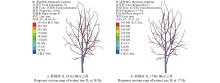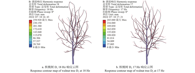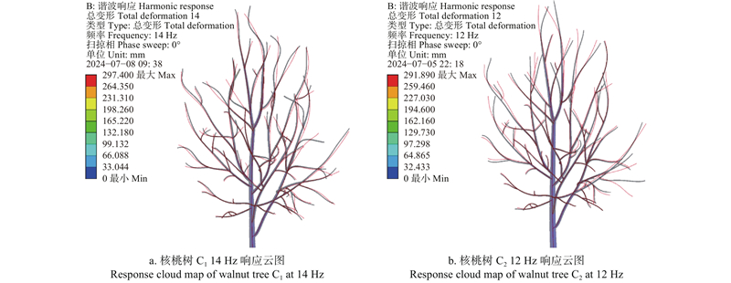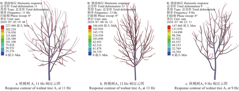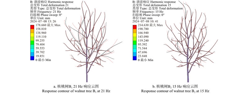 目的: 探究不同尺寸核桃树受迫振动时的响应情况,解决核桃振动采收过程中效率低下、果实采净率低等问题。方法: 利用地面三维激光扫描仪采集核桃树点云数据,对采集到的树体点云数据进行预处理后提取树木骨架,采用NX软件对核桃树进行三维拟合重建,建立不同尺寸参数的核桃树三维模型。通过实测频谱对核桃树材料特性参数进行修正,实际与仿真共同出现的共振频率中最大相对误差仅为0.22%,确保三维模型的准确性。应用Ansys对核桃树树体三维模型进行谐响应分析,探究激振频率、激振力、激振高度3个参数对振动加速度的影响,分析不同尺寸核桃树在不同频率下的位移和加速度响应情况;结合挂果枝位移、加速度响应和谐响应云图上核桃树的响应情况进一步探究不同尺寸核桃树的适宜采收频率。结果: 核桃树的加速度响应峰值随直径、高度和冠幅增加而降低,较高树体和大冠幅对高频振动的响应较弱,表明树体的几何特性显著影响其振动特性。对核桃树振动采收参数进行响应面分析并优化,得到核桃树振动采收的最优振动参数组合,在最优振动参数激振下核桃采收率均在90%以上,表明该振动频率参数可为核桃树振动采收装置工作时的参数设置提供参考。结论: 根据本研究描述的核桃树建模方法可以实现对核桃树细小侧枝的重建,且重建出来的整树模型具有更为真实的生长形态特征;不同直径、不同高度、不同冠幅的核桃树振动响应不同,适宜振动频率范围为10~20 Hz,可根据树形结构参数进一步确定该频率范围。