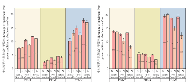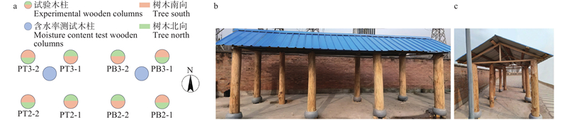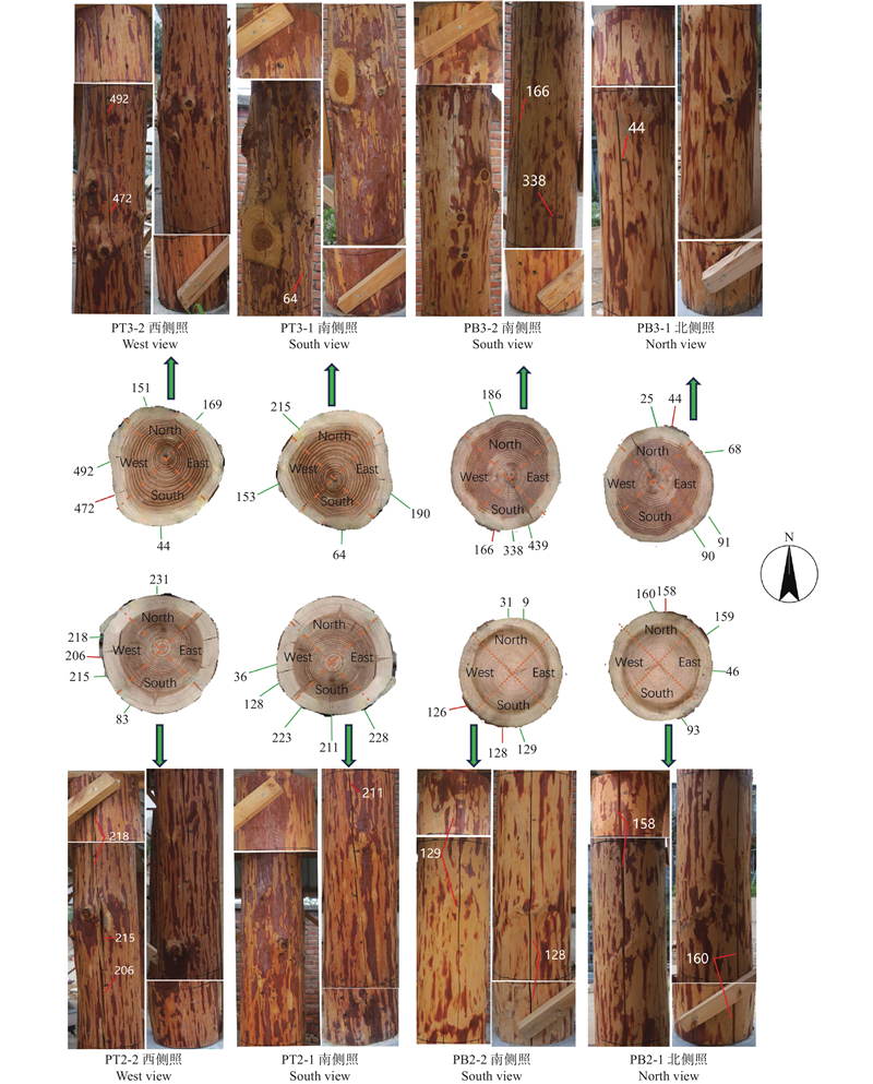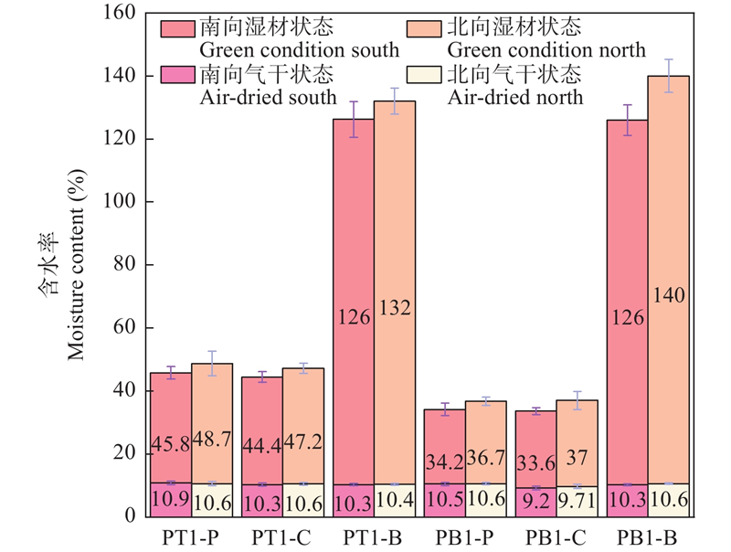 目的: 解析华北落叶松边缘木南北朝向木材物理力学性质的差异,探究原木立柱室外暴露过程中南北朝向木柱裂缝的发生发展机制,为华北落叶松原木和实木的合理利用提供科学理论指导。方法: 依据树木生长特征,在阴坡选择华北落叶松南边缘木和北边缘木为研究对象,分析南北朝向对木材生长轮宽度、微观构造和物理力学性质的影响规律。设计顶棚遮盖下的原木立柱室外暴露试验,探究室外环境下南北朝向对木柱开裂的影响。结果: 在综合环境因素影响下,华北落叶松南边缘木和北边缘木均表现出北向生长轮宽度较宽;在相同树高下,同株华北落叶松边缘木南北朝向在微观形貌上无明显差异,北向试件的气干含水率较南向试件高,但南向试件的密度和各向干缩率高于北向;力学强度在南北向的变异规律与密度变化呈高度正相关,北边缘木力学强度的南北向差异最大,南向边材抗弯强度、抗弯弹性模量、顺纹抗压强度相较于北向分别高53.7%、76.9%、21.4%。华北落叶松原木立柱为期10个月的室外暴露试验过程中,木柱在去除树皮后因水分蒸发导致的内外含水率梯度而迅速出现开裂现象;边材含水率迅速下降,由110%~130%降至54%~70%,心材含水率基本稳定在30%~38%,此时裂缝主要表现为长度增长、宽度基本保持不变;当边材含水率降至纤维饱和点后(15%~21%),裂缝长度基本保持不变,但部分裂缝宽度继续增加;当原木立柱含水率整体降至13%~15%时,裂缝形态趋于稳定。华北落叶松南边缘木相较于北边缘木更容易出现大裂缝,阳光照射是影响木柱裂缝分布的关键因素。结论: 在本试验范围内,华北落叶松南边缘木和北边缘木生长轮总宽度窄侧和宽侧物理力学性质存在差异,通过对同株华北落叶松生长轮宽窄的测定可以预测不同位置处的木材性质差异。原木立柱室外暴露过程中木柱裂缝更容易在生长轮总宽度较窄柱面形成,实际使用过程中以木柱生长轮总宽度较宽侧作为阳面可有效减少木柱开裂现象。
