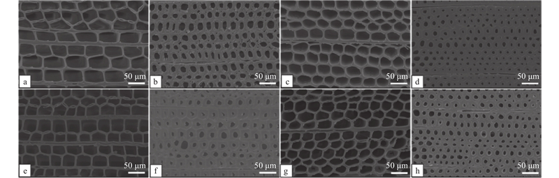 横切面显微构造 a、b:PB1边材处早材和晚材Earlywood and latewood at PB1 sapwood;c、d:PB1心材处早材和晚材显微构造Earlywood and latewood microstructure at PB1 heartwood;e、f:PT1边材处早材和晚材Earlywood and latewood at PT1 sapwood;g、h:PT1心材处早材和晚材Earlywood and latewood at PT1 heartwood. PB:北边缘木Northern edge tree; PT:南边缘木Southern edge tree."