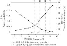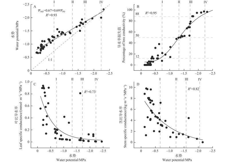 干旱胁迫下叶片、茎水力学性状随叶凌晨水势的变化情况 每一个黑点代表一盆植株数据的平均值。Ⅰ、Ⅱ、Ⅲ、Ⅳ分别代表胁迫的4个阶段,在图B中“12”、 “50”、“88”分别代表导水率损失值达到12%、50%、88%。Each black dot represents the average of the data for one pot of plants. Ⅰ, Ⅱ, Ⅲ and Ⅳ represent the four stages of stress, and in Fig. 3B, “12”, “50” and “88” represent the values of loss of hydraulic conductivity reaching 12%, 50% and 88%, respectively."