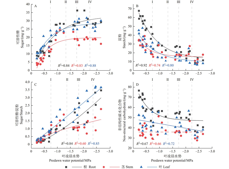 干旱胁迫下非结构性碳水化合物含量随叶凌晨水势的动态变化 不同符号及颜色分别代表根、茎、叶相应指标的情况。每一个符号代表当天所有重复组对应指标的平均值。虚线表示变化差异不显著,P>0.05。Different symbols and colors represent the corresponding indicators for roots, stems and leaves, respectively. Each symbol represents the mean value of the corresponding indicator of all replicate groups on that day. The dotted line indicates that the difference in variation is not significant, P>0.05."