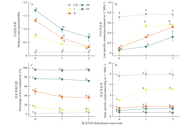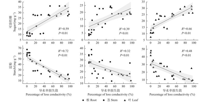 目的: 探究红桦在干旱胁迫下水力学和碳代谢特性,揭示其致死阈值与死亡机制,明晰红桦在全球气候变暖背景下生存与适应能力,也为红桦苗木培育及森林经营提供理论参考。方法: 对4年生红桦幼苗进行持续干旱胁迫,根据叶片外观及生理状态划分为4个胁迫阶段(阶段Ⅰ,达到叶片膨压损失点;阶段Ⅱ,叶片下垂;阶段Ⅲ,叶片开始干枯;阶段Ⅳ,叶片完全枯黄),到达每个胁迫阶段后进行阶段复水(1周,2周,4周),干旱胁迫期间及复水特定阶段测定:土壤体积含水量,叶凌晨水势、正午水势,叶比导水率,茎比导水率、茎导水率损失值,根、茎、叶可溶性糖及淀粉含量并计算非结构性碳水化合物(NSC)总量。结果: 1) 干旱胁迫至4个阶段时,叶凌晨水势分别下降到–0.732、–1.32、–1.712、–2.23 MPa,胁迫到最终阶段,茎比导水率、叶比导水率分别下降94.5%、99.1%,导水率损失超过88%,各器官可溶性糖含量上升,淀粉含量下降,可溶性糖与淀粉比值上升,根NSC总量下降到62.6%,可溶性糖和淀粉含量与导水率损失值有显著相关性(P<0.01)。2) 复水后,Ⅰ、Ⅱ、Ⅲ 阶段各器官可溶性糖含量显著高于对照组(P<0.05),在此胁迫阶段红桦幼苗的水分运输能力可以得到恢复,Ⅳ阶段红桦幼苗水力学性状无法恢复,根、茎的NSC含量低于对照组水平。3) 4个阶段红桦幼苗茎导水率损失值分别为15.57%±0.61%、49.49%±5.03%、77%±2.52%、96.4%±1.11%,死亡率为0,0,33.3%,100%。结论: 干旱胁迫期间红桦幼苗水力学性状与NSC存在耦合关系,红桦幼苗通过动态调节各器官碳分配模式,将淀粉转化成可溶性糖,应对持续干旱胁迫对水分运输的影响,复水后,红桦幼苗水力学性状与NSC的恢复程度会受到前期干旱胁迫程度的影响,水力失衡和碳饥饿共同发生在植株死亡过程中,红桦幼苗的茎导水率损失值为77%时已有死亡风险。