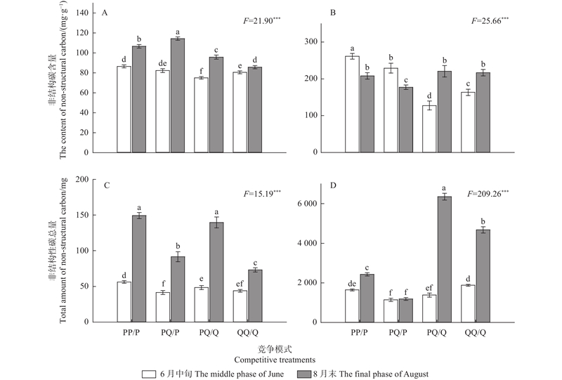 Objective: This study aims to compare the plasticity of root system structure and the seasonal variations of non-structure carbon in interspecific and intraspecific competition between Q. variabilis and P. tabuliformis, and elucidate the competitive mechanism in forest succession, so as to provide theoretical basis for the efficient cultivation of oak-pine mixed forests. Method: Two-year-old seedlings of Q. variabilis and P. tabuliformis were used as research objects, and three competition scenarios of P. tabuliformis–P. tabuliformis, P. tabuliformis–Q. variabilis, and Q. variabilis–Q. variabilis were set up. Root system structural traits and non-structure carbon were measured, and the two-factor analysis of variance was used to explore the effects of competition scenarios and seasons on root system structure and non-structure carbon were explored using. Result: Compared with intraspecific competition, the interspecific competition of P. tabuliformisQ. variabilis inhibited the root length, root surface area, fine roots, and total root volume of P. tabuliformis seedlings, while the interspecific competition promoted the coarse root volume of Q. variabilis seedlings. The soluble sugar, starch and non-structural carbohydrate contents in fine roots and whole plant of P. tabuliformis seedlings under the P. tabuliformis–Q. variabilis interspecific competition were significantly lower than those in the P. tabuliformis intraspecific competition, while the above-mentioned indicators of Q. variabilis seedlings in the interspecific competition were basically higher than those in the Q. variabilis intraspecific competition, and the differences were even more pronounced at the end of August. Conclusion: Q. variabilis seedlings shows stronger adaptability and competitive advantage in P. tabuliformis–Q. variabilis interspecific competition. Both species can adjust their root system structure and non-structure carbon levels seasonally to optimize their competitive strategies. These findings help to understand the succession process of P. tabuliformis–Q. variabilis mixed forests and provide theoretic basis for efficient cultivation of P. tabuliformis–Q. variabilis mixed forests.