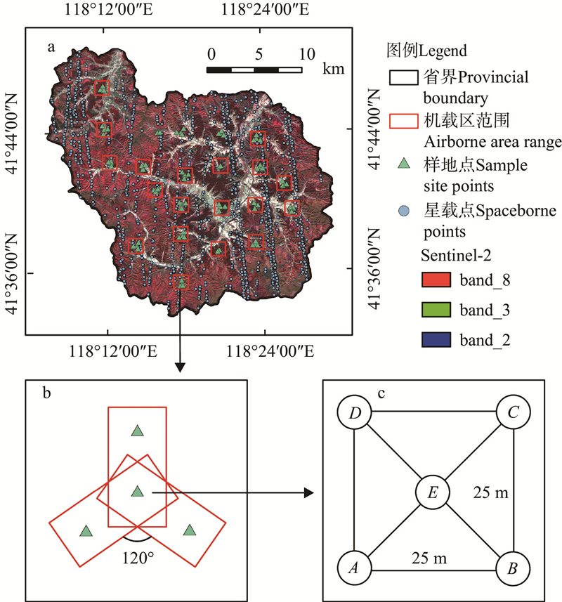 研究区位置、遥感数据及样地设置示意 a:样地点、星载点和无人机区域分布;b:无人机飞行条带;c:样地设置示意,A、B、C、D表示分别样地的4个角点,E表示样地中心点。a: Distribution map of sample sites, spaceborne points and UAV areas; b: UAV flight strips; c: Schematic diagram of the sample site settings. A, B, C, D irepresent the four corner points of the sample plots, and E represents the center point of the sample plot."