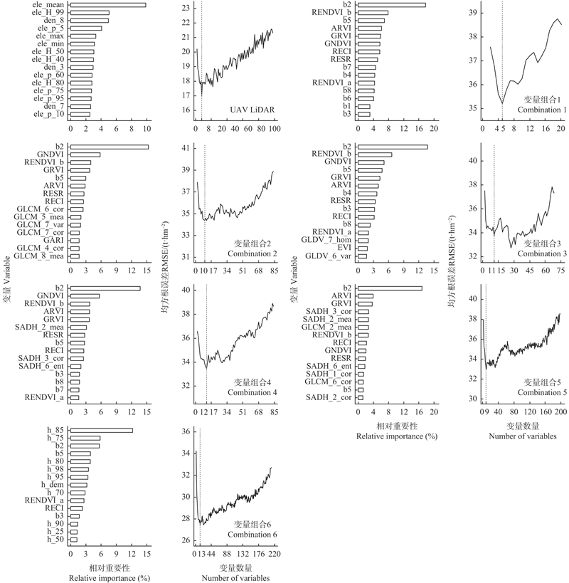 变量重要性排序和RMSE变化 ARVI:大气阻抗植被指数 Atmospherically resistant vegetation index;DVI:差值植被指数 Difference vegetation index;EVI:增强植被指数 Enhanced vegetation index;GARI:绿色大气阻力指数 Green atmospherically resistant index;GDVI:绿差植被指数 Green difference vegetation index;GNDVI:绿色归一化差异植被指数 Green normalized difference vegetation index;RECI:红边叶绿素指数 Red edge chlorophyll index;RENDVI_a:红边归一化差值植被指数a Red edge normalized difference vegetation index a;RENDVI_b:红边归一化差值植被指数b Red edge normalized difference vegetation index b;RESR:红边简单比值 Red edge simple ratio;$ B_i=\mathrm{Band}_i,\ i= $1、2、…、8:单波段反射率 Single band reflectivity;$ \text{GLCM}\_ i\_ j $:灰度共生矩阵 Gray level co-occurrence matrix;$ \mathrm{G}\text{LDV}\_ i\_ j $:灰度差分向量 Gray level difference vector;$ \text{SADH}\_ i\_ j $:和差直方图 Sum and difference histogram;RMSE:均方根误差 Root mean square error."