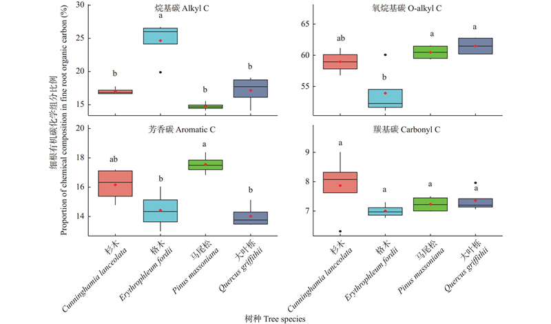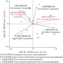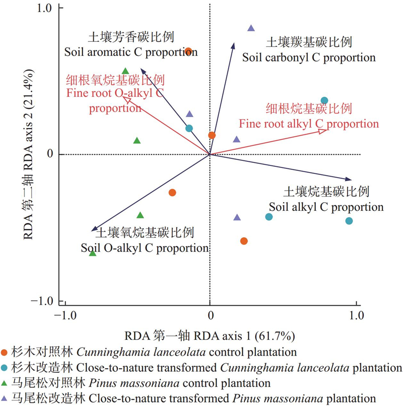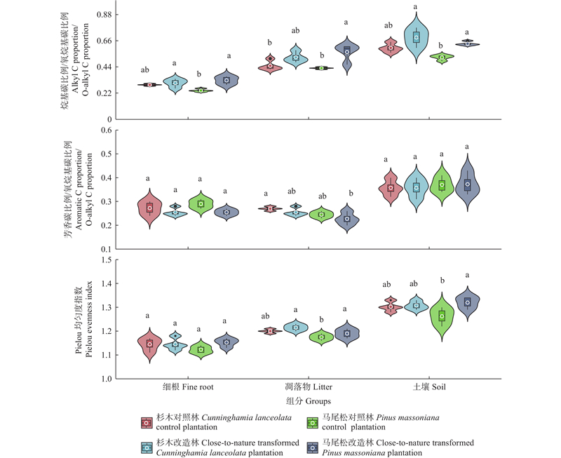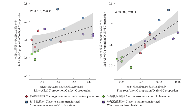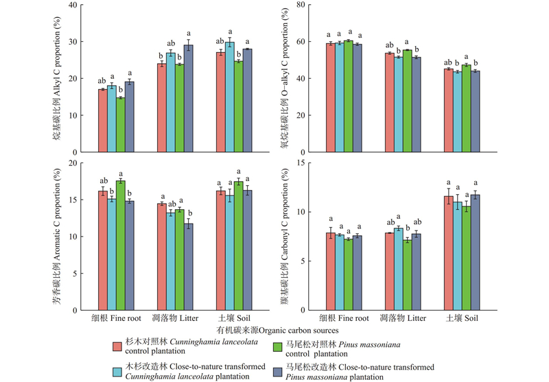 目的: 探究近自然化改造对南亚热带针叶人工林土壤有机碳化学组分及其分布均匀性的影响,为揭示针叶人工林近自然经营土壤有机碳化学稳定性机制提供参考依据。方法: 以经过疏伐后在林下补植乡土阔叶树(大叶栎和格木)的马尾松和杉木近自然化改造林及未改造纯林(包括马尾松改造林、杉木改造林、马尾松对照林和杉木对照林)为对象,采用13C核磁共振技术系统分析土壤、凋落物和细根的有机碳化学组分(烷基碳、氧烷基碳、芳香碳、羰基碳),并利用Pielou均匀度指数评估土壤、凋落物和细根总有机碳中各类有机碳组分分布的均匀程度。结果: 1) 近自然化改造可显著改变马尾松林凋落物、细根和土壤有机碳化学组分:凋落物中,烷基碳比例提高,而氧烷基碳和芳香碳比例降低;细根中,烷基碳比例提高,芳香碳比例降低;土壤中,烷基碳比例提高,氧烷基碳比例降低(P<0.05);然而,近自然化改造对杉木人工林凋落物、细根和土壤中的各有机碳化学组分均无显著影响。2) 马尾松改造林土壤、凋落物和细根的烷基碳比例/氧烷基碳比例比值以及凋落物、土壤Pielou均匀度指数均显著提高。3) 近自然化改造可显著增加土壤微生物生物量碳,但并未显著影响土壤细菌Chao1多样性指数和Shannon-Wiener多样性指数。4) RDA分析表明,细根烷基碳比例和氧烷基碳比例是影响土壤有机碳化学组分最关键的2个因子,说明与凋落物相比,细根有机碳化学组分是导致纯林和改造林土壤有机碳化学组分差异的关键因素。结论: 近自然化改造对土壤有机碳化学稳定性的影响具有明显的树种特异性:马尾松林改造后土壤有机碳化学组分分布更均匀,烷基碳比例及烷基碳比例/氧烷基碳比例比值显著提升,有效增强了有机碳的化学稳定性,而杉木林改造后未产生类似效应。