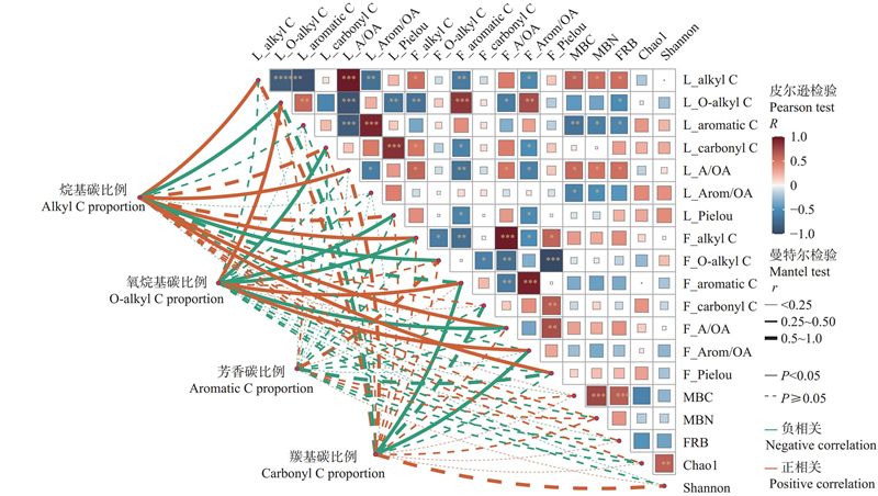 土壤有机碳化学组分比例与植物微生物指标之间的相关性 *P<0.05,**P<0.01,***P<0.001. L_alkyl C:凋落物烷基碳比例Litter alkyl C proportion;L_ O-alkyl C:凋落物氧烷基碳比例Litter O-alkyl C proportion;L_aromatic C:凋落物芳香碳比例Litter aromatic C proportion;L_carbonyl C:凋落物羰基碳比例Litter carbonyl C proportion;F_alkyl C:细根烷基碳比例Fine root alkyl C proportion;F_O-alkyl C:细根氧烷基碳比例Fine root O-alkyl C proportion;F_aromatic C:细根芳香碳比例Fine root aromatic C proportion;F_carbonyl C:细根羰基碳比例Fine root carbonyl C proportion;L_A/OA:凋落物烷基碳比例/氧烷基碳比例Litter alkyl proportion/O-alkyl C proportion;F_A/OA:细根烷基碳比例/氧烷基碳比例Fine root alkyl proportion /O-alkyl C proportion;L_Arom/OA:凋落物芳香碳比例/氧烷基碳比例Litter aromatic C proportion/O-alkyl C proportion;F_Arom/OA:细根芳香碳比例/氧烷基碳比例Fine root aromatic C proportion/O-alkyl C proportion;L_Pielou:凋落物Pielou均匀度指数Litter Pielou evenness index;F_Pielou:细根Pielou均匀度指数Fine root Pielou evenness index;MBC:微生物生物量碳Microbial biomass carbon;MBN:微生物生物量氮Microbial biomass nitrogen;Chao1:细菌Chao1多样性指数Bacterial Chao1 diversity index;Shannon:细菌香农-维纳多样性指数Bacterial Shannon-Wiener diversity index;FRB:细根生物量Fine root biomass."