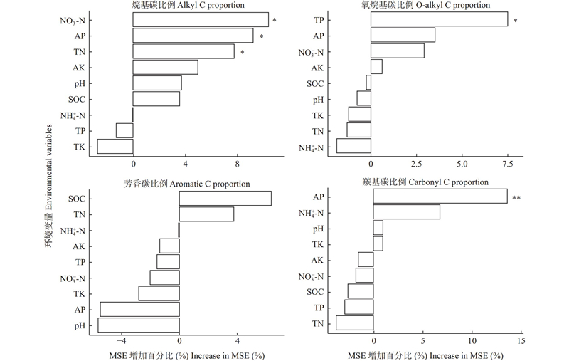 随机森林分析土壤化学性质对烷基碳、氧烷基碳、芳香碳和羰基碳比例的影响 MSE: 均方误差Mean squared error. *P<0.05,**P<0.01. TK: 全钾含量Total potassium;SOC: 土壤有机碳含量Soil organic carbon content;TP: 全磷含量Total phosphorus content;AK: 速效钾含量Available potassium content;TN: 全氮含量Total nitrogen content;NH4+-N: 铵态氮含量Ammonium nitrogen content;AP: 有效磷含量Available phosphorus content;NO3−-N: 硝态氮含量Nitrate nitrogen content."