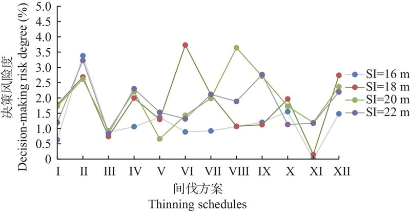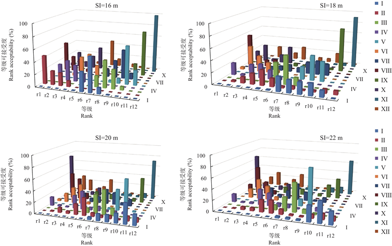 目的: 针对人工林多目标经营决策中主观偏好依赖性强、目标权重不确定导致决策结果不准确的问题,以长白落叶松人工林为研究对象,通过全面探索多维权重空间,为人工林多目标经营提供科学合理的决策依据。方法: 运用随机多准则可接受性分析(SMAA)方法,结合长白落叶松人工林林分生长模拟系统,开展不同立地条件下(SI=16、18、20、22 m)的多目标经营最优间伐方案研究。以林分年均木材产量、净现值(NPV)和轮伐期内平均碳储量为目标,探讨12种备选间伐方案(上层或下层间伐,间隔期5和10年,间伐强度10%、20%和30%)在不同立地条件下的动态效果,通过分析不同间伐方案的整体可接受性指数(
