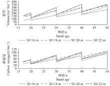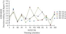 | 立地指数 Site index/m | 备选间伐方案 Alternative thinning schedules | 年均木材产量Mean annual wood production/(m3·hm?2a?1) | 轮伐期内平均碳储量Average carbon storage over the rotation /(t·hm?2) | 净现值Net present value/(104 yuan·hm?2) |