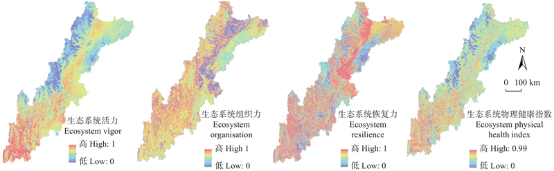| 生态活力 Ecological vigor | 生态组织力 Ecological organization | 生态恢复力 Ecological resilience | 产水量 Water yield | 生境质量 指数Habitat quality index | 碳储量 Carbon storage | 土壤保持量 Soil retention capacity | |||