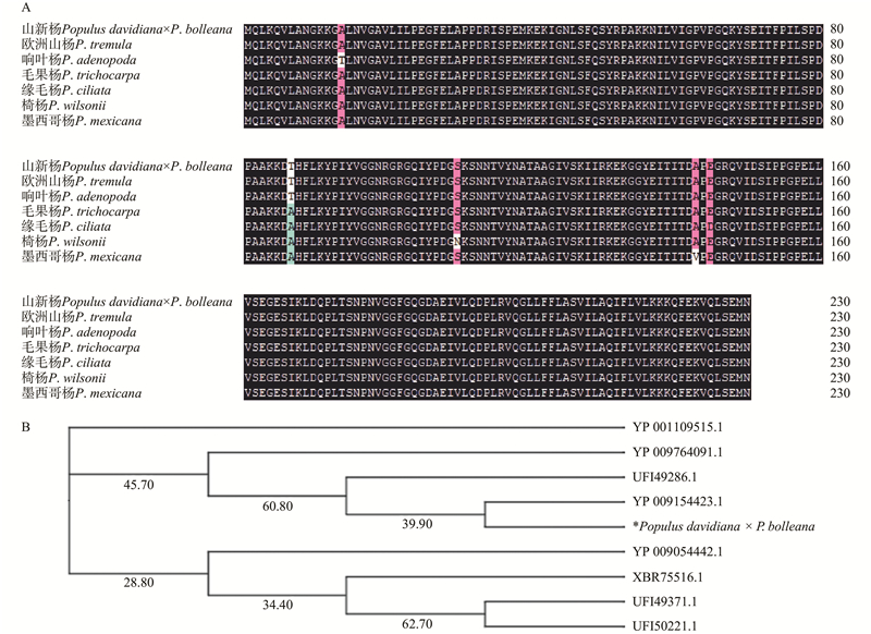 PdbpetA基因多序列比对和进化树分析 YP_009764091.1:墨西哥杨Populus mexicana;UFI49286.1:响叶杨Populus adenopoda;YP_009154423.1:欧洲山杨Populus tremula;YP_001109515.1:毛果杨Populus trichocarpa;XBR75516.1:苦杨Populus laurifolia;YP_009054442.1:胡杨Populus euphratica;UFI49371.1:阿富汗杨Populus afghanica;UFI50221.1:缘毛杨Populus ciliata."