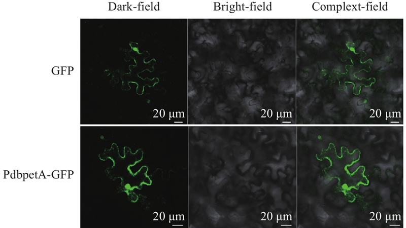 | pBI121-PdbpetA-GFP | gactctagactggtacccgggATGCAACTAAA ACAAGTTCTTGCTAAT | atactagtcagtcgacccgggGAAATTCATTT CGGACAATTGAAC | 构建pBI121-GFP载体 Construction of the pBI121-GFP vector |