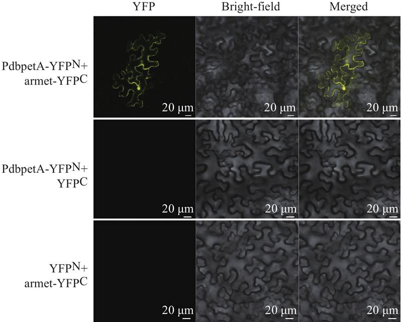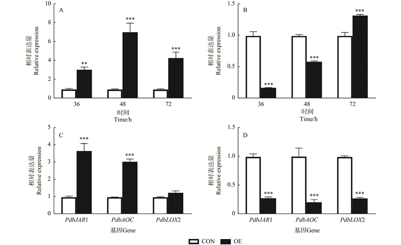 目的: 探究山新杨PdbpetA基因的表达特性和生物学功能,明确该基因在舞毒蛾口腔效应子Armet诱导下激活并调控植株防御反应的分子机制,为深入了解植物抗虫性机制以及抗性育种提供参考。方法: PCR克隆获得山新杨PdbpetA基因完整ORF序列,采用酶切、同源重组等技术将PdbpetA基因序列构建至植物瞬时表达、亚细胞定位和双分子荧光互补载体中,利用瞬时转化系统分析PdbpetA蛋白在烟草细胞中的定位;应用农杆菌介导的植物瞬时转化法获得PdbpetA基因瞬时表达的转基因山新杨,运用实时荧光定量RT-PCR技术检测PdbpetA基因在山新杨中的组织表达特异性,分析对照和转基因山新杨茉莉酸合成相关基因PdbJAR1、PdbAOC和PdbLOX2的相对表达量,通过酵母双杂交系统筛选山新杨PdbpetA的互作蛋白。结果: PdbpetA基因开放阅读框(ORF)长696 bp,编码231个氨基酸,在成熟叶中表达量最高,定位于细胞核和细胞膜中;瞬时过表达山新杨中PdbpetA基因的相对表达量在转化后48 h时达到峰值,瞬时抑制表达山新杨中PdbpetA基因的相对表达量在转化后36 h时被显著抑制;在舞毒蛾幼虫取食的过表达PdbpetA基因山新杨中,PdbJAR1、PdbAOC和PdbLOX2基因的相对表达量均显著上调表达,在瞬时抑制表达PdbpetA的植株中茉莉酸合成基因表达量均显著下降;蛋白互作分析表明,PdbKunitz和PdbrDNA与PdbpetA存在互作关系。结论: 山新杨PdbpetA基因不仅参与植物茉莉酸的合成,同时可能通过与PdbKunitz和PdbrDNA蛋白的相互作用参与植物的防御反应。