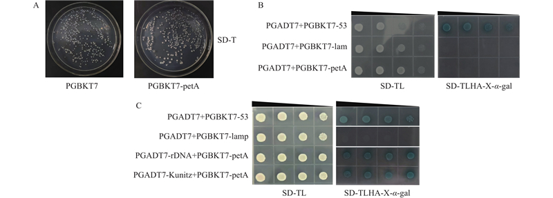PdbpetA蛋白毒性与互作验证 A:诱饵蛋白毒性检测。以转化PGBKT7空载体为对照,检测转入petA蛋白对酵母有无毒性,SD-T:色氨酸酵母缺陷型培养基。Toxicity assay of the bait protein. The yeast strain transformed with the empty PGBKT7 vector served as the control to assess the potential toxicity of the petA protein. SD-T denotes a synthetic dropout medium lacking tryptophan;B:petA蛋白自激活验证。PGADT7+PGBKT7-53/lam分别为阳性与阴性对照,SD-TL:色氨酸、亮氨酸酵母缺陷型培养基,SD-TLHA-X-α-gal:缺少色氨酸、亮氨酸、组氨酸、腺嘌呤同时添加显色底物的酵母培养基。Self-activation verification of the petA protein. PGADT7+PGBKT7-53 and PGADT7+PGBKT7-lam served as the positive and negative controls, respectively. SD-TL represents a synthetic dropout medium lacking tryptophan and leucine, while SD-TLHA-X-α-gal indicates a medium lacking tryptophan, leucine, histidine, and adenine, supplemented with the chromogenic substrate X-α-gal;C:petA、rDNA以及Kunitz蛋白的互作验证。"