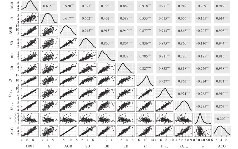 湿地松生长因子的相关性 上三角为变量之间的相关系数,下三角为2个变量的散点图,对角线为每个变量密度分布情况。DBH:胸径;H:树高;AGB:地上部分生物量;SB:主干生物量;BB:分枝生物量;LB:针叶生物量;D:地径;D1.0 m:距地1.0 m树干直径;D1.5 m:距地1.5 m树干直径;ρ:木材密度;ACG:地上部分碳储量。The upper triangle shows the correlation coefficients between variables, the lower triangle displays scatter plots between pairs of variables, and the diagonal represents the density distribution of each variable. DBH:Diameter at breast height;H: Tree height;AGB: Above-ground biomass;SB: S tem biomass;BB: Branch biomass;LB:Leaf biomass;D:Ground diameter;D1.0 m:Diameter at 1.0 m height;D1.5 m:Diameter at 1.5 m height;ρ:Density of wood;ACG: Above-ground carbon storage. ***:P<0.001;**:P<0.01;*:P<0.05。"