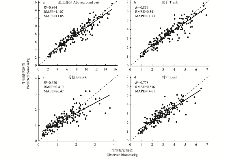| 针叶生物量 Leaf biomass | 0.773 | 0.542 | 0.405 | 15.15 | 0.037 | 2.071 | 0.213 | ||