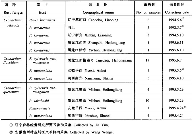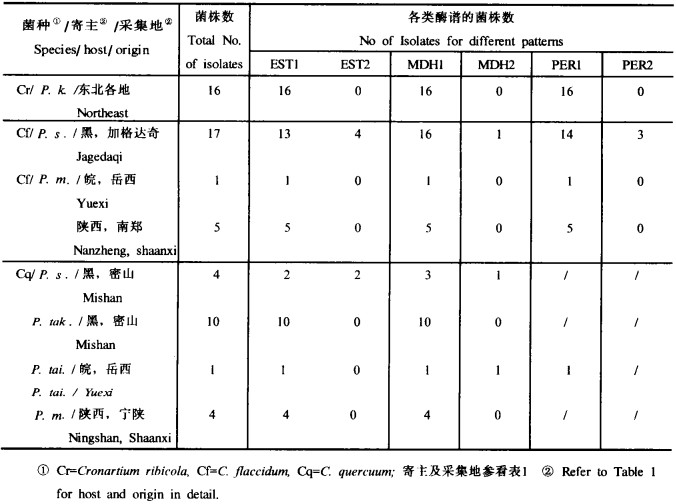 从我国不同地区、不同松树上采集代表Cronartium ribicola、C.flaccidum及C.quercuum3种松干锈菌的58个菌株,分析了其种间及种内的同工酶变异。电泳检测过的13种酶中有8种显出酶带,其中酯酶(EST)同工酶谱具最显著而稳定的种间差异,可作为区别鉴定3种松干锈菌的有效手段。在来自东北各地红松上的16个C.ribicola菌株中未发现任何酶谱变异,显示了本菌群体遗传性质的均一。来自东北地区樟子松上的17个C.flaccidum菌株中存在酶谱变异,但多数菌株的酶谱同来自安徽及陕西马尾松上的菌株完全一致,此结果支持把我国的C.flaccidum看成一个集合种。来自我国南北不同地区不同松树的C.quercuum菌株,除樟子松上的部分菌株外,其酶谱完全相同,尚未分化出北美的那种专化型间的酶谱差异,可能暗示我国松瘤锈菌的起源晚于北美。