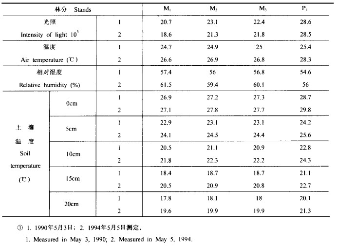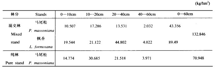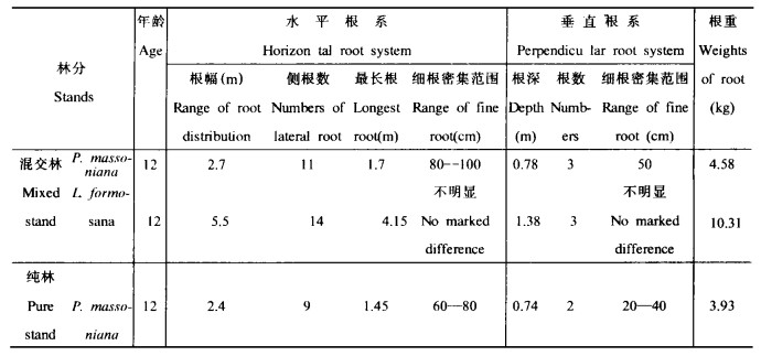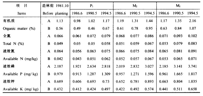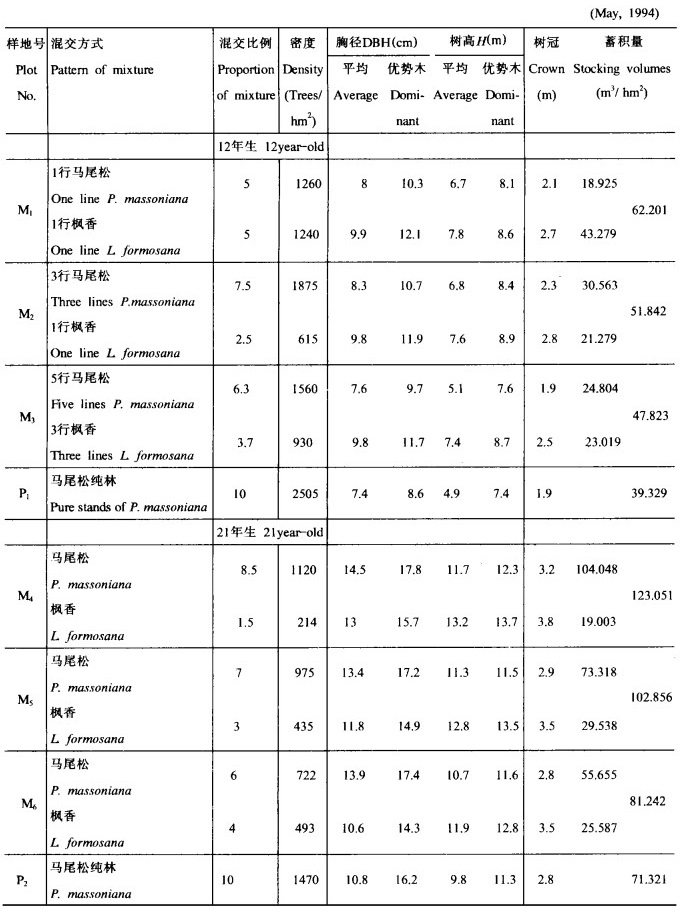 Successive cultivation of pure coniferous plantations has many defects. Planting mixed coniferousbroad-leaved forests. is one of the most available methods to dispel these defects. Thus in 1982, we introduced a dozen of broad-leaved tree species, and established 35 hm2. coniferous broad-leaved forests at Lu' an, Anhui Province, in order to select the appropriate mixture combinations, mixture pattern and proportion. This report deals with a part of the research of project. The results, from experimental study done in the past several years, showed that the mixed stand of Pinus massoniana and Liquidambar formosana with rational proportion and mixture pattern had significant economical and ecological benefits. The mixtures were suitable for maintaining soil fertility and site productivity in long-term, promoting its growth and establishing a stable, man-made forest ecosystem. The growing stock in 12-year-old mixed stands was from 47.823 m3/hm2 to 62.201m3/hm2, 13.9%-72.5% higher than that of the pure stand of masson pine. The content of organic matter in the soil increased by 52.3%, total N increased by 24.1%, quickacting N, P, K increased by 13.7%, 25.2% and 26.8% respectively. The microclimatic condition was improved apparently. Meanwhile, the mixtures increased accumulation of chlorophyl in the leaves of masson pine. The daily average rate of net photosynthesis of masson pine in the mixed stand was 7.72 mgCO2·Dm-2·h-1, 20.8% higher than that of the control.