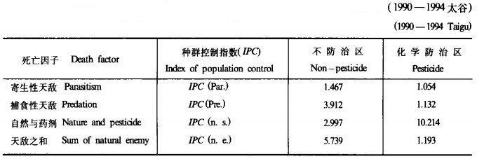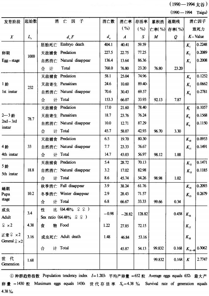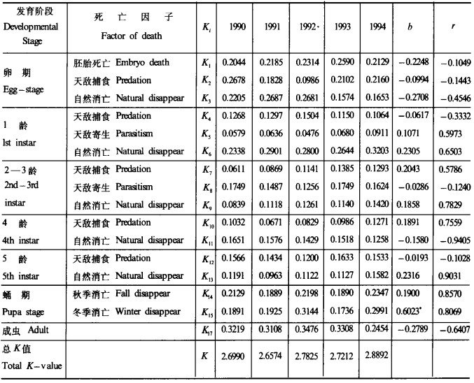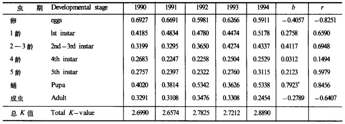 1989-1995年在山西省太谷枣区、稷山枣区对枣步曲自然种群进行了系统调查, 组建了5个年世代生命表。 1个平均生命表。枣步曲自然种群存活曲线属Price A型, 平均种群趋势指数I为1.203。枣步曲幼虫期受天敌控制作用显著, 种群控制指数为5.739。关键虫期为蛹期, 关键因子为蛹的冬季消亡。并根据越冬后正常蛹数及平均生命表中的平均存活率预测次年4龄幼虫, 准确率达90%左右, 有效地指导了防治。