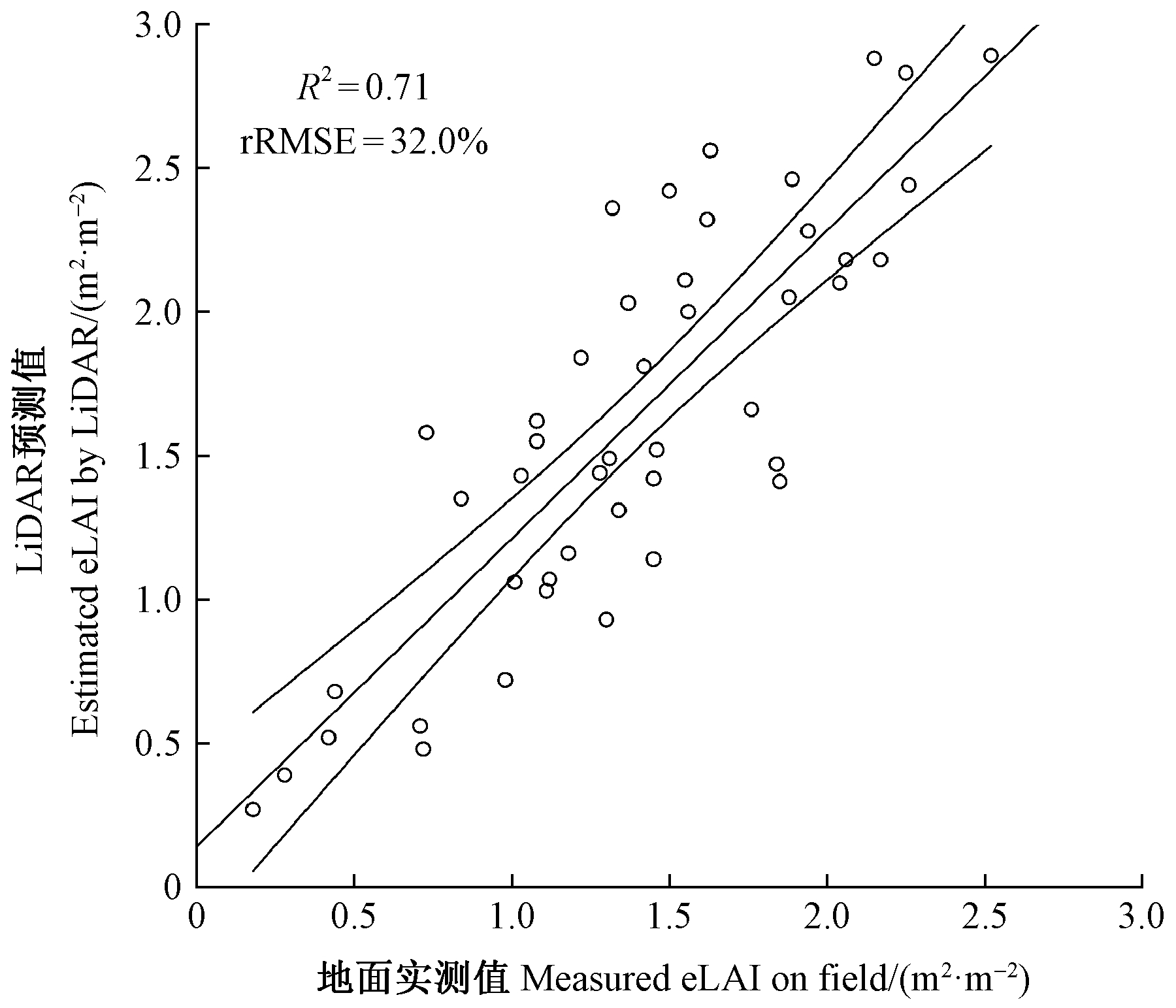 目的: 精确估测银杏人工林有效叶面积指数(eLAI),以更好了解银杏人工林的生长和竞争、理解人工林生态系统的功能和生产力。方法: 基于多旋翼无人机激光雷达(LiDAR)系统获取的点云数据,结合45块地面实测样地数据,使用孔隙度模型法(通过计算点云的冠层穿透率,根据Beer-Lambert定律计算有效叶面积指数)和统计模型法(首先通过地面实测的有效叶面积指数和所提取的LiDAR特征变量建模,然后借助拟合的模型估测有效叶面积指数)对我国典型银杏人工林进行样地尺度的有效叶面积指数估测。结果: 1)使用统计模型法估测eLAI时,仅利用LiDAR高度特征变量估测精度为R2=0.38(rRMSE=54%),引入其他特征变量(冠层密度特征、冠层容积比以及强度特征变量)后精度分别达到R2=0.64(rRMSE=26%)、R2=0.61(rRMSE=28%)、R2=0.74(rRMSE=23%);2)根据Cover将样地分组建模后发现,分组建模的精度优于不分组建模的精度;3)孔隙度模型法估测有效叶面积指数的精度为R2=0.71(rRMSE=32.0%)。结论: 结合多组LiDAR特征变量估测有效叶面积指数能够充分挖掘LiDAR数据包含的冠层结构特性,从而提升估测精度;同时,使用孔隙度模型法可以有效估测银杏人工林有效叶面积指数。无人机LiDAR点云在估测银杏人工林有效叶面积指数上具有较好的潜力。