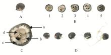 单叶蔓荆果实组织结构及种子萌发 A.完整果实Complete fruit;B.果实横切面Fruit cross section 1: 4粒种子Four seeds;2: 3粒种子Three seeds;3: 2粒种子Two seed;4: 1粒种子One seeds;5:无种子No seeds. C.果实横切面(图中等比例扩大3倍)Fruit cross section (triple the proportion) a.外果皮Exocarp; b.内果皮Endocarp;c.外果皮和内果皮之间排列成环的油点The oil spots are arranged in a ring between exocarp and endocarp;d.种子Seed。D.种子发芽过程Seed germination."