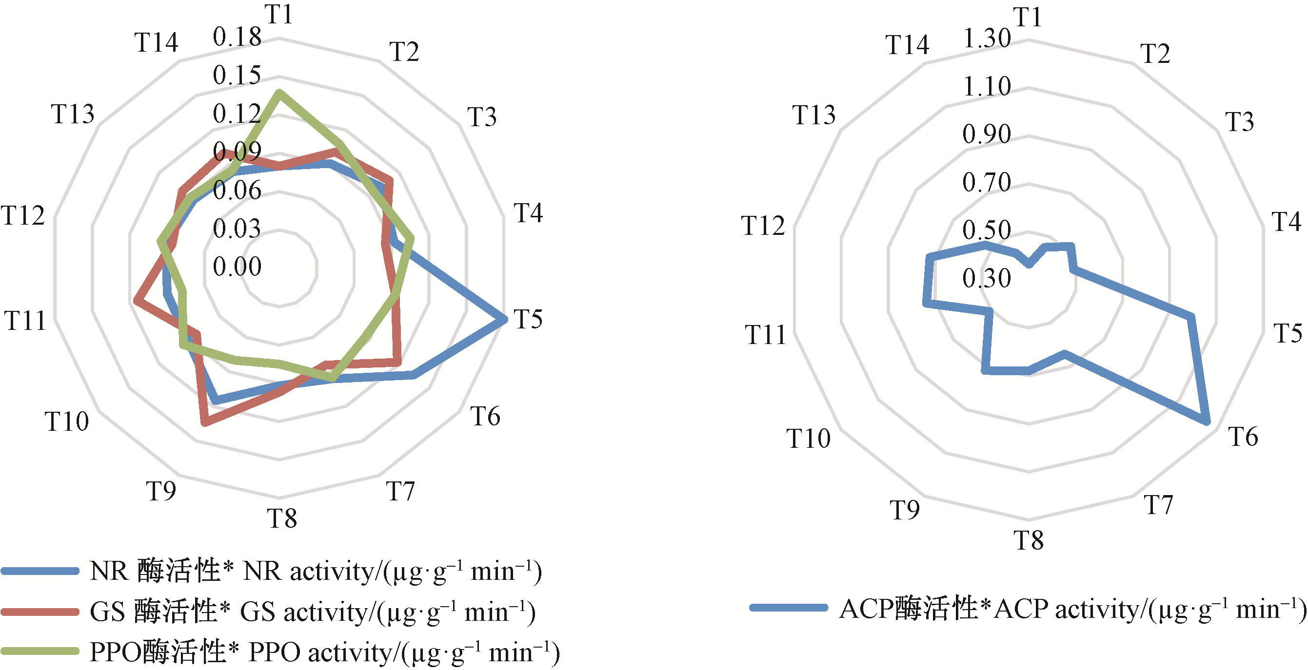目的: 研究不同氮(N)、磷(P)和钾(K)施肥量和施肥方式影响闽楠叶片光合特性、内含物含量, 酶活性及植株养分吸收量, 揭示施肥调控光合碳固定机制, 为闽楠壮苗培育和科学施肥提供理论依据。方法: 采用"3414"田间试验方法, 分析不同N、P和K施肥处理对闽楠幼苗光合色素含量、光合作用参数、叶片内含物及相应酶活性的影响; 通过极差分析, 筛选最佳的氮磷钾施肥方式; 通过逐步回归分析、相关分析和通径分析, 构建施肥调控光合碳固定途径。结果: 1) N、P、K施肥提高闽楠叶片光合色素含量, 光合、蒸腾和水分利用能力, 抑制叶片可溶性糖, 可溶性蛋白和丙二醛含量, 提高叶片硝酸还原酶、谷氨酰胺合成酶和酸性磷酸酶活性, 抑制多酚氧化酶活性, 进而提高叶片淀粉含量, 促进碳固定。在光合碳固定中, 叶片酸性磷酸酶、水分利用效率和淀粉含量是调控的关键点。2) N元素增强硝酸还原酶活性, 提高叶绿素a含量, 增强水分利用效率, 促进碳固定。3) P元素提高叶绿素b含量, 降低丙二醛含量, 保护细胞完整性, 提高碳同化效率, 但对于光合产物碳代谢无显著影响。4) K元素提高叶绿素a和b含量, 增大气孔导度, 提高气孔CO2和水分利用效率, 提高淀粉含量, 促进光合碳固定。5) 在N、P、K配施下, N, P和K吸收量最大, 与酸性磷酸酶呈极显著相关, 最有利于光合碳固定; 其次为N、P配施, 最差的为单施磷肥, 以T6(N: 0.532 g·plant-1, P2O5: 0.133 g·plant-1, K2O: 0.356 g·plant-1)处理效果最好。结论: 施肥后, 闽楠幼苗吸收N、P和K, 加大叶片气孔通气, 显著提高气孔导度和蒸腾速率, 提高水分利用效率, 增强闽楠幼苗的净光合速率, 促进光合产物的输出, 提高蛋白质合成, 在酸性磷酸酶的作用下调控碳代谢, 产生淀粉, 为其生长提供物质和能量。