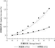 目的: 研究冰温状态下蓝莓鲜果质量损失率与质构参数随时间的变化规律及其相关性,为蓝莓鲜果采后品质预测及感官评价提供理论依据。方法: 以‘北村’蓝莓为试验材料,(-1±0.5)℃为冰温组,(4±0.5)℃为对照组,分别对2种温度状态下蓝莓鲜果质量损失率及硬度、脆性、弹性、咀嚼性、内聚性和黏附性等6项质构参数进行测定,通过数据拟合与线性回归反映出蓝莓鲜果质量损失率与质构参数随时间的变化规律,进行相关性分析确定与蓝莓鲜果质量损失率呈显著相关的质构参数。结果: 冰温状态下,蓝莓鲜果质量损失率Y与时间X0的拟合模型为Y=0.197 36exp(X0/5.850 47)-0.184 5,呈指数式增长,增长趋势明显小于对照组;蓝莓鲜果各项质构参数在试验期间随时间呈不同程度的下降趋势,且均优于对照组。蓝莓鲜果冰温下质量损失率Y与硬度X1、脆性X2、咀嚼性X3等3项质构参数呈显著负相关(P<0.05),构建回归方程为Y=4.772-0.011X1-0.017X2-0.306X3结论: 冰温贮藏更有助于蓝莓鲜果品质的保持。冰温状态下,蓝莓鲜果质量损失率及各质构参数与时间构建的回归模型拟合精度较高。确定了冰温状态下蓝莓鲜果的硬度、脆性和咀嚼性是与蓝莓鲜果质量损失率变化相关的主要质构参数。