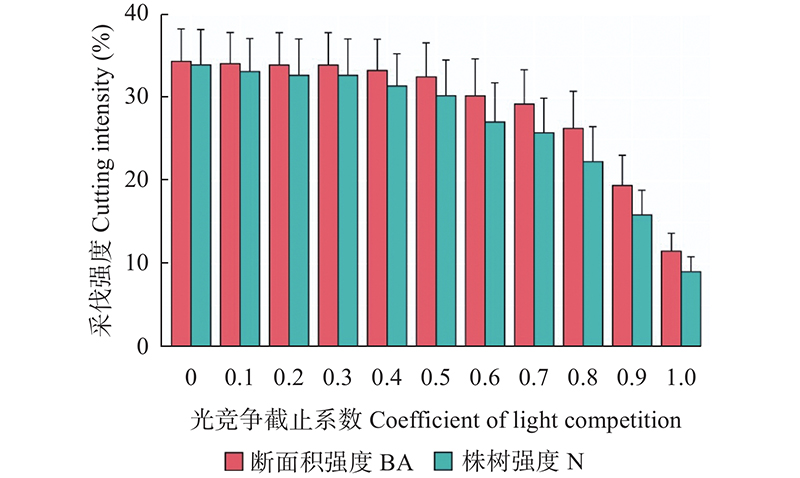目的: 以崇礼冬奥核心区华北落叶松人工近熟林为研究对象,探讨目标树抚育间伐采伐木选择方法及其对林分空间结构的影响,为更加合理开展森林经营活动、促进人工林质量提升提供科学依据。方法: 设置并调查6块面积0.09 hm2(30 m×30 m)标准地,按125株·hm?2目标树密度,采用定性与定量指标相结合的方法标记目标树。基于树冠重叠和树冠光竞争高度构建采伐木选择指标,设置不同光竞争截止系数(c)模拟选择采伐木,分析采伐强度变化,运用角尺度、混交度、密集度、交角竞争指数、林层指数和综合空间结构指数分析不同c值下目标树和林分空间结构指标的变化。结果: c取值在0~1之间时,株数采伐强度和断面积采伐强度在10%~35%范围内变化,且呈随c值增大而降低的相同变化趋势。经模拟采伐后目标树空间结构得到优化,改善幅度随采伐强度增大而增大。综合空间结构指数在