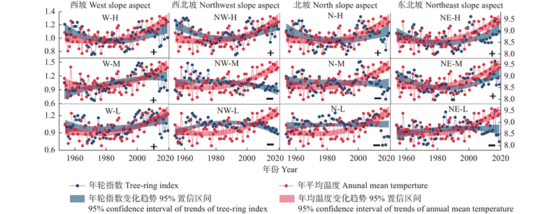 目的: 研究气候变化背景下青藏高原东缘典型优势树种岷江冷杉的分异现象与坡向和海拔的空间关联,揭示该地区岷江冷杉发生分异的原因和响应机制。方法: 采用树木年轮方法,在青藏高原东缘米亚罗林区岷江冷杉4个主要分布坡向(东北、北、西北、西)的3个海拔梯度(3 650、3 800和3 950 m)采集875根岷江冷杉的树芯,去除生长趋势后建立12个基于地形点位的岷江冷杉标准年表。利用回归分析方法研究岷江冷杉径向生长与增温的分异现象,应用Pearson相关分析和滑动相关分方法分析1955—2019年岷江冷杉径向生长与气候因子的相关性及其动态变化。结果: 1) 4个坡向林线岷江冷杉径向生长均未发生分异,西坡未出现分异,北坡、西北坡中低海拔和东北坡低海拔均与增温趋势表现出分异。2) 在5个发生分异的样点中,中低海拔北坡和低海拔西北坡岷江冷杉的径向生长与生长季(6月)降水呈显著负相关(P<0.05);中海拔北坡和西北坡分别与前一年9月降水和10月温度呈显著负相关(P<0.05);低海拔北坡与4月和9月温度呈显著负相关(P<0.05)。3) 1955—2019年,中海拔北坡岷江冷杉径向生长与前一年9月和6月降水的负相关关系趋于显著(P<0.05);低海拔北坡与4月和9月温度的负相关关系趋于显著(P<0.05),与6月降水的负相关关系趋于显著(P<0.05);中海拔西北坡与前一年10月温度保持稳定的显著正相关关系(P<0.05);低海拔西北坡与6月降水的负相关关系趋于显著(P<0.05),与6月温度的显著负相关关系趋于不相关;低海拔东北坡与前一年9、10和12月,当年1、5和9月温度的负相关关系均趋于显著(P<0.05)。结论: 相比偏阳的东北坡和西坡,岷江冷杉出现分异现象的海拔分别在北坡和西北坡更低。岷江冷杉的分异现象与前一年生长季末和当年非生长季的干旱胁迫密切联系。未来气候变化背景下,低海拔岷江冷杉的生长响应具有不确定性,但林线岷江冷杉的径向生长将受益于增温。