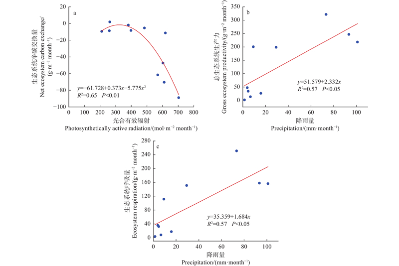 目的: 量化温带天然落叶阔叶林生态系统净碳交换量,探究净碳交换在日和季节尺度上对环境的响应,为温带天然落叶阔叶林生态系统碳循环模型构建和精准估算提供科学依据。方法: 以北京怀柔区喇叭沟门典型白桦?山杨天然落叶阔叶林生态系统为研究对象,采用涡度相关法测定该生态系统净碳交换量和相关环境因子,基于小波分析等方法定量分析日和季节尺度生态系统净碳交换量与环境因子的时滞关系及其主要影响因子。结果: 1) 北京喇叭沟门白桦?山杨天然落叶阔叶林生态系统2022年生态系统总生产力、生态系统呼吸量和生态系统净碳交换量分别为1 330、930和?400 g·m?2a?1。2) 在日尺度上,生态系统呼吸量的主要影响因子为空气温度,时滞时间为2.82 h,生态系统总生产力和生态系统净碳交换量主要受光合有效辐射影响,且与光合有效辐射同步变化,光合有效辐射主要通过生态系统总生产力影响生态系统净碳交换量。3) 在季节尺度上,光合有效辐射是生态系统净碳交换量的主要影响因子,时滞时间为14.2天,虽然降雨量是影响生态系统呼吸量和生态系统总生产力变化的主要因子,但由于生态系统呼吸量和生态系统总生产力对降雨量响应的一致性,相互抵消后使得降雨量对生态系统净碳交换量的影响较小。结论: 因深山易受云雾遮挡,相较空气温度,白桦?山杨天然落叶阔叶林生态系统净碳交换量在日和季节尺度上对光合有效辐射的响应更敏感,但其响应机制存在差异。