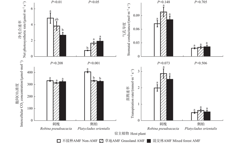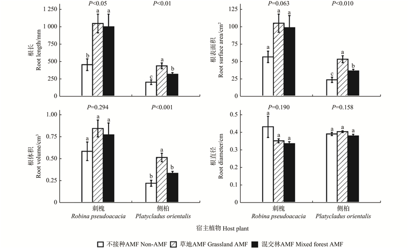 Objective: In order to elucidate the potential mechanism through which arbuscular mycorrhizal fungi (AMF) facilitated the invasion and spread of exotic plants, the feedback effect of AMF domesticated by both the exotic plant Robinia pseudoacacia and the native plant Platycladus orientalis on photosynthetic properties, root architecture, mycorrhizal characteristics and growth of the host plants and the interrelationships among these variables were investigated. Method: Rhizosphere soil collected from the mixed forest of R. pseudoacacia and P. orientalis and adjacent grassland in Wangdonggou watershed, Changwu county, Shaanxi Province, was served as AMF inoculum. A pot experiment was conducted to determine the effects of the different inoculum on leaf gas exchange parameters, root architecture, mycorrhizal characteristics and seedling growth of both species. Result: 1) Compared to non-AMF treatment, AMF inoculation significantly increased the root length of R. pseudoacacia and the biomass, net photosynthetic rate, root length, root surface area, and root volume of P. orientalis. Conversely, it decreased the net photosynthetic rate of R. pseudoacacia and the intercellular CO2 concentration of P. orientalis. 2) Compared to grassland AMF treatment, mixed forest AMF significantly reduced the net photosynthetic rate of R. pseudoacacia and the biomass, root length, root surface area and root volume of P. orientalis. 3) The mycorrhizal colonization and soil hyphal density of both species inoculated with mixed forest AMF were significantly lower than those in grassland AMF treatment. 4) P. orientalis exhibited significantly higher dependency on grassland AMF than on mixed forest AMF, whereas R. pseudoacacia showed low dependency on AMF, with no significant difference between grassland AMF and mixed forest AMF treatments. 5) The biomass of AMF-inoculated P. orientalis was positively correlated with its root length, root surface area, root volume, root diameter, arbuscular colonization rate and soil hyphal density. Among these, root length, arbuscular colonization rate, and hyphal density had the highest explanatory power for the variation in biomass. Conclusion: Inoculated with mixed forest AMF significantly decreased root colonization rate and soil hyphal density of P. orientalis. This alteration, combined with the synergistic effect of mycorrhizal symbiosis on the root architecture, significantly suppressed its growth under pot conditions, weakened its competitive advantage and enhanced the competitive ability of R. pseudoacacia, thereby facilitating the invasion and spread of R. pseudoacacia.