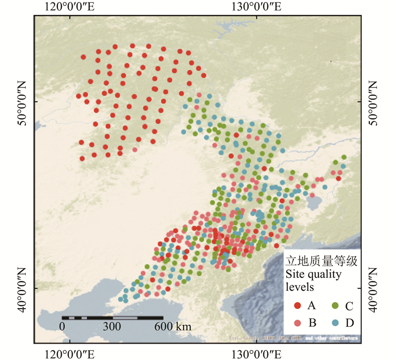 目的: 以包括大兴安岭、小兴安岭和长白山脉在内的整个东北地区天然次生林为研究对象,将其划分成大兴安岭、小兴安岭、张广才岭、长白山和辽东山区5个区域,以“区域”为哑变量对东北天然次生林进行立地质量评价,对比分析不同区域立地质量分布格局的差异,为东北天然次生林立地质量的精准评价和林分质量的精准提升提供一定依据。方法: 选取东北地区456块0.1 hm2永久性圆形样地为数据来源,依据Assmann标准筛选出优势木并考虑样地全部树种断面积加权的优势木高为基础建模数据,在7个常用的理论生长方程中选择出最佳导向曲线,采用广义代数差分法(GADA)推导立地形模型,将“区域”作为哑变量构建出最终的哑变量模型,选取决定系数(R2)、均方根误差(RMSE)和平均绝对误差(MAE)评价模型拟合优度。基于模型得到各区域的立地形值并对其进行分析比较,探讨东北天然次生林立地生产力的分布格局。结果: 采用GADA法推导的立地形模型的R2为0.335,将“区域”作为哑变量后各区域的R2显著提高,RMSE和MAE均有所下降。东北天然次生林立地质量空间分布呈现出显著异质性,优(A)和良(B)等级立地主要集中分布于大兴安岭和长白山主体区域。大兴安岭优(A)等级立地占比超过90%,立地质量等级占比自差(D)至优(A)呈递增趋势;小兴安岭中(C)、差(D)等级立地占比达80%以上,南部立地质量显著优于北部;张广才岭优(A)、良(B)等级立地仅占35.6%,且靠近长白山的区域立地质量更优;长白山优(A)、良(B)等级立地占比超过60%,整体立地质量呈上升趋势;辽东山区中(C)、差(D)等级立地占主导地位,空间分布呈现与长白山邻近区域质量提升的特征,不同区域立地质量分布也存在显著差异。结论: 在广义代数差分法基础上建立的以“区域”为哑变量的立地形模型,其拟合精度和预测能力显著增强。基于该模型对东北天然次生林进行立地质量评价,不同区域的立地质量分布格局存在显著差异。本研究可为实现森林资源可持续发展和生态保护提供一定的理论支持,未来研究应综合考虑环境因素,以深入理解森林生态系统的动态变化,为森林管理和保护策略提供指导。