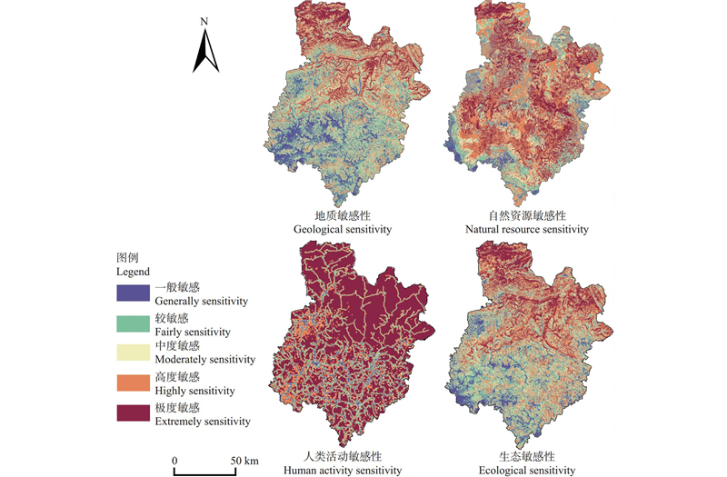 人活动敏感性 Sensitivity to human activities | 人口密度 Population density/km?2 | 5 641~18 748 | 1 902~5 640 | 525~1 901 | 146~524 | 0~145 |
