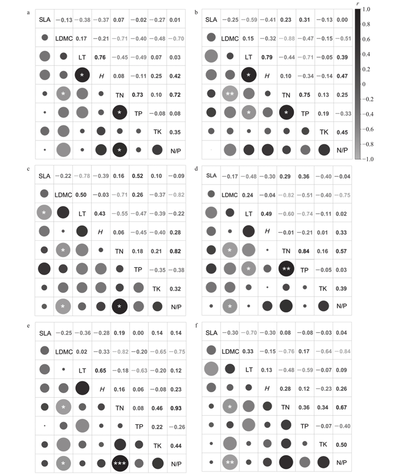 目的: 以亚热带毛竹林8种主要林下植物为对象,探究其叶片功能性状对模拟氮沉降的响应,明确林下不同植物对氮沉降的生态适应策略,为区域毛竹林生态系统的氮沉降管理提供科学依据。方法: 设置冠上与冠下2种模拟氮沉降方式以及有机氮(尿素与甘氨酸混合)和无机氮(硝酸铵)2种氮形态,共6个处理组:冠上无机氮添加、冠上有机氮添加、冠上对照(冠上清水添加)、冠下无机氮添加、冠下有机氮添加和冠下对照(冠下清水添加)。各处理组氮添加量统一为50 kg·hm?2a?1,对照组施以等量清水。试验3年后,测定4种灌木(寒莓、山莓、紫金牛和紫藤)和4种草本(绵穗苏、淡竹叶、金星蕨和苔草)的8项叶片功能性状(比叶面积、叶片干物质含量、叶片厚度、株高、全氮含量、全磷含量、全钾含量和氮磷比)。结果: 1) 除叶片干物质含量外,植物叶片功能性状对模拟氮沉降的响应未受氮沉降模拟方法(冠上/冠下)和沉降氮形态(有机/无机)的显著影响,但表现出显著的种间差异,主要体现在草本与灌木之间以及豆科与非豆科灌木之间。2) 模拟氮沉降使草本和灌木叶片氮含量均显著上升;草本叶片钾含量和氮磷比显著提高,而叶片干物质含量显著下降;灌木株高显著增加;豆科灌木株高显著增加但比叶面积显著降低;非豆科灌木叶片氮含量和氮磷比均显著提高。3) 叶片干物质含量与氮含量在所有处理下均呈显著负相关;叶片氮含量与磷含量仅在冠上对照、冠上无机氮添加和冠下对照处理下呈显著正相关;氮磷比与氮含量仅在冠上对照、冠上有机氮添加、冠下无机氮添加处理下呈显著正相关;比叶面积与叶片厚度仅在冠上有机氮添加处理下呈显著负相关;叶片厚度与株高在冠上对照、冠上无机氮添加处理下呈显著正相关。结论: 本研究揭示出毛竹林林下草本和灌木、豆科和非豆科灌木对氮沉降的适应策略差异。在氮沉降处理下,草本植物通过提高叶片氮含量、降低叶片干物质含量,在强化资源获取型策略的同时弱化资源保守型策略;非豆科灌木仅增加资源获取型功能性状如叶片氮含量,而未调整资源保守型功能性状;豆科灌木通过维持叶片氮磷计量平衡以适应氮富集环境。