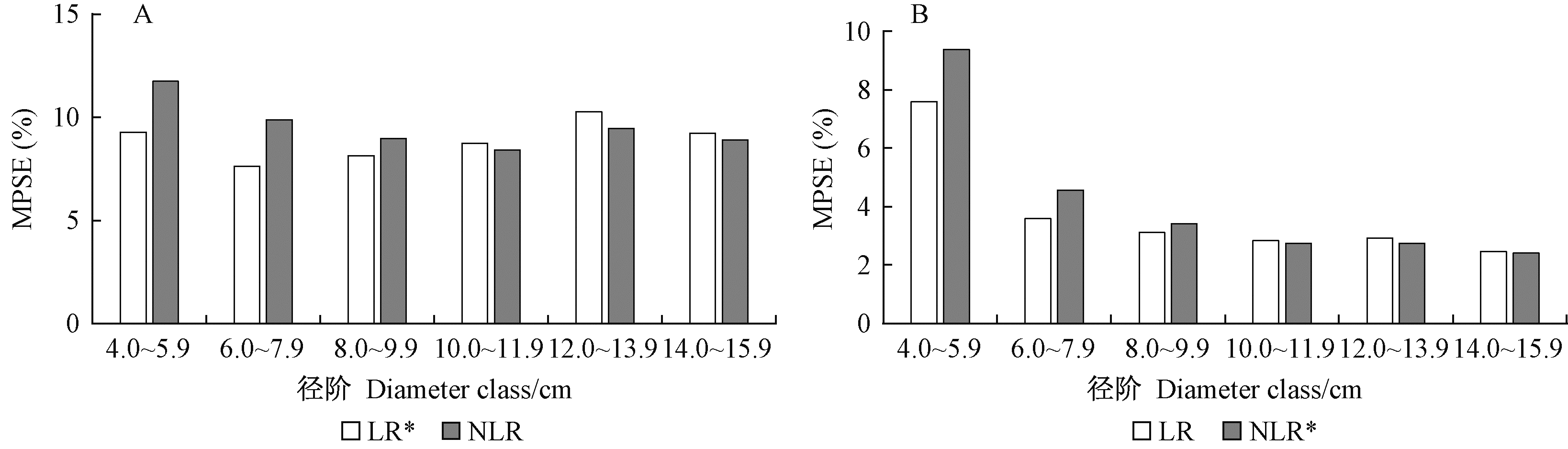 Objective: Based on the accurate measuring of the stem volume of moso bamboo(Phyllostachys edulis), the research on bamboo stem volume models was conducted to accurately estimate the stem volume and to provide a theoretical basis for the management of bamboo forest. Method: Taking moso bamboo as the research object, based on the measured data of 216 samples of bamboo from Lin'an, Qingyuan, Wuyi, Changshan, Ninghai, Anji, Zhuji, Yuyao, Huangyan and Taishun county of Zhejiang Province, drainage method that could measure the volume of irregular shaped object was used to measure the bamboo stem volume. Firstly, based on the allometric equation and the equation proposed by Terasaki Watari, taking the diameter at breast height(D)and the internode length of bamboo at breast height(L)as the independent variables, one unary model(M1)and four binary models(M2-M5)were selected to establish the three bamboo stem volume models with all the samples data. Secondly, model error structures were analyzed with the likelihood analysis with which whether the log-transformed linear models or nonlinear weighted models were chosen for model fitting. The parameter estimations were obtained by fitting regression of the models using ForStat2.2 software. Finally, the bamboo stem volume model that fit for Zhejiang Province well and had stable parameters and higher prediction accuracy was selected according to analysis towards the results of t test for the parameter estimates and 4 validation statistics, namely the adjusted coefficient of determination(Ra2), the standard error of the estimate(SEE), the mean errors(ME)and the mean systematic errors(MSE). Result: The Akaike's information criterion(AICc)of the 5 basic models were calculated with the likelihood analysis of model error structure. The results showed that the value of ΔAICc was larger than 2, which indicated the multiplicative error and the use of log-transformed model for model fitting. The parameters of the 5 bamboo stem volume log-models established were stable for the absolute t-value was larger than 2. All of the Ra2 were above 0.95, and the SEE and MSE were around 0, respectively, which reflected the well-fitting, and the model M2 fit the best. The statistics of model fitting and prediction across diameter classes were investigated as well. The results illustrated that the fitting and prediction performance across diameter classes of the 5 models was quite preferable, yet better when assuming the medium diameter classes and a bit worse as assuming the class of 4.0-5.9 cm and that of 14.0-15.9 cm. Finally, the prediction log-models with correction did not perform a better fitting effects and prediction precision. Conclusion: Drainage method is a better method for accurate measurement of bamboo stem volume. Likelihood analysis is suitable to analyze the error structure and provide with a reliable justification of choosing the fitting models. The evaluation accuracy of binary models is higher than that of unary model as the variable H and L are introduced. Considering the easier and more accurate measurement of internodes length of bamboo at breast height(L)in practice, and the stem volume model M5 performs better than model M2, the suggested suitable model for predicting the stem volume is M5 that is based on variable D-L, i.e.V=0.191 2D2.114 9e-6.841 1/L.