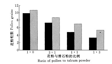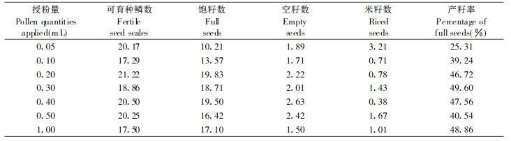 The pollination experiments were carried out in Pinus tabulaeformis Carr. Seed orchard located at Lushi county in Henan province during 1993~1995, The pollination efficiencies of different pollination experiments were also analysed. The first pollen grain arriving at the integument arms was preferentially engulfed over pollen approaching later during female cone receptive period. The optimal time of pollination was the first 4 days after flowering. The controlled pollination carried out within 2~3 days after flowering gave the greatest efficiency with 54% of full seeds. The repeated pollination during receptive period could not significantly increase seed numbers over single pollination. The 45%~50% of full seeds in cone could be produced when 0.2~0.4 mL of pollen was applied to one pollination bag, and a markable decline in pollination efficiency be followed when less than 0.1 mL of pollen was applied. The mixtures of fresh pollen with dead pollen or talcum powder at the ratio of 1:1 could produce the same percentage of full seeds as pure fresh pollen applied. In addition, the pollination efficiencies of different treaments, the determination of weighted values for flowering synchronization indexes and changes of flowering synchronization indexes after weighting were preliminarily discussed.